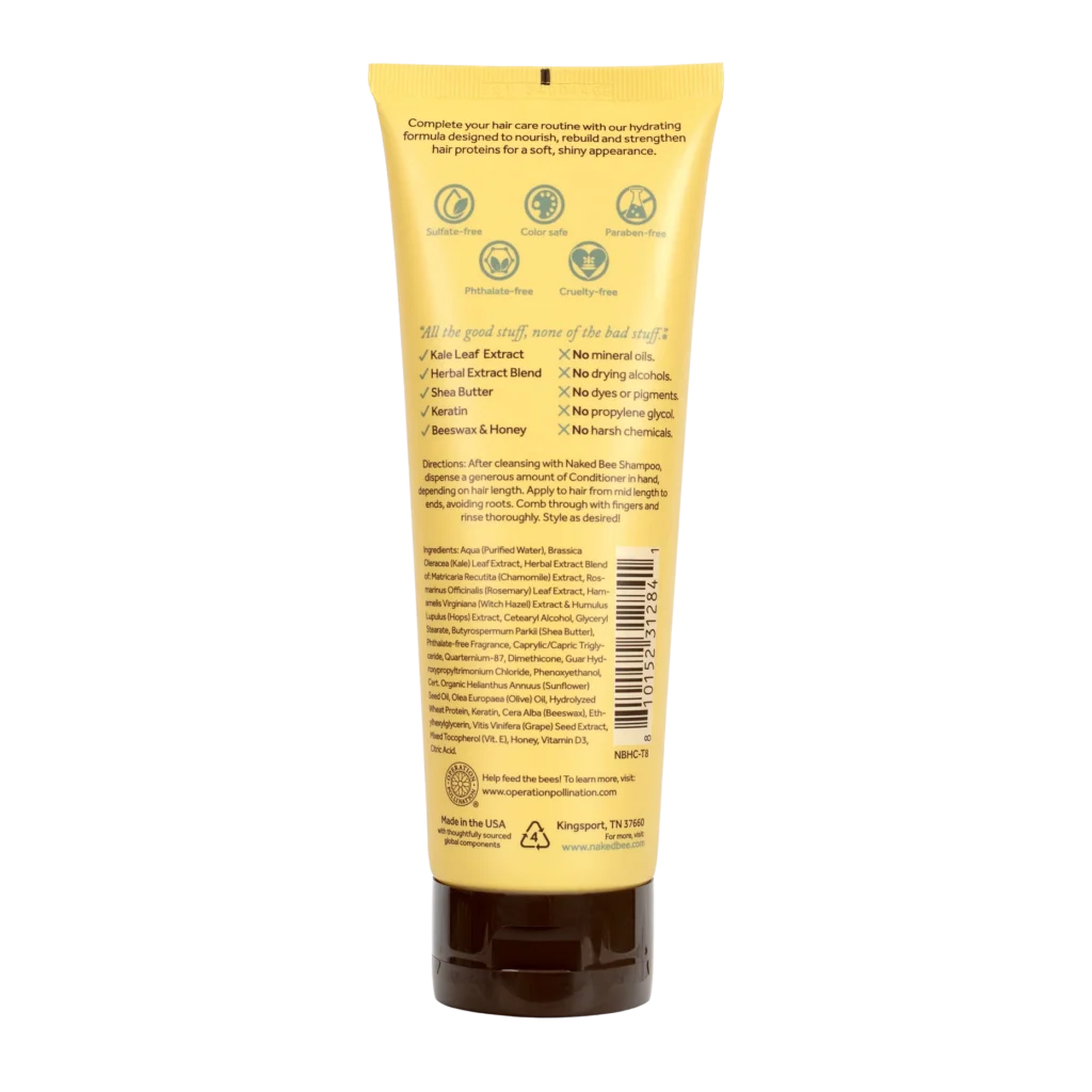 Ingredients: Aqua (Purified Water), Brassica Oleracea (Kale) Leaf Extract, Herbal Extract Blend of: Matricaria Recutita (Chamomile) Extract, Rosmarinus Officinalis (Rosemary) Leaf Extract, Hamamelis Virginiana (Witch Hazel) Extract & Humulus Lupulus (Hops) Extract, Cetearyl Alcohol, Glyceryl Stearate, Butyrospermum Parkii (Shea Butter), Phthalate-free Fragrance, Caprylic/Capric Triglyceride, Quaternium-87, Dimethicone, Guar Hydroxypropyltrimonium Chloride, Phenoxyethanol, Cert. Organic Helianthus Annuus (Sunflower) Seed Oil, Olea Europaea (Olive) Oil, Hydrolyzed Wheat Protein, Keratin, Cera Alba (Beeswax), Ethylhexylglycerin, Vitis Vinifera (Grape) Seed Extract, Mixed Tocopherol (Vit. E), Honey, Vitamin D3, Citric Acid.
