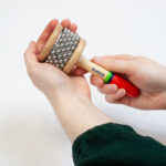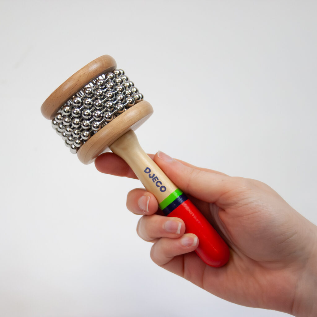 This wooden mini cabassa is a great addition to any sensory toolbox! Simply hold the handle in one hand and rest the head of the instrument with the metal balls on the palm of your other hand, then turn the cabassa back and forth for a delightful and satisfying shh-shh rattling sound! You can also shake the cabassa for a slightly different sound.