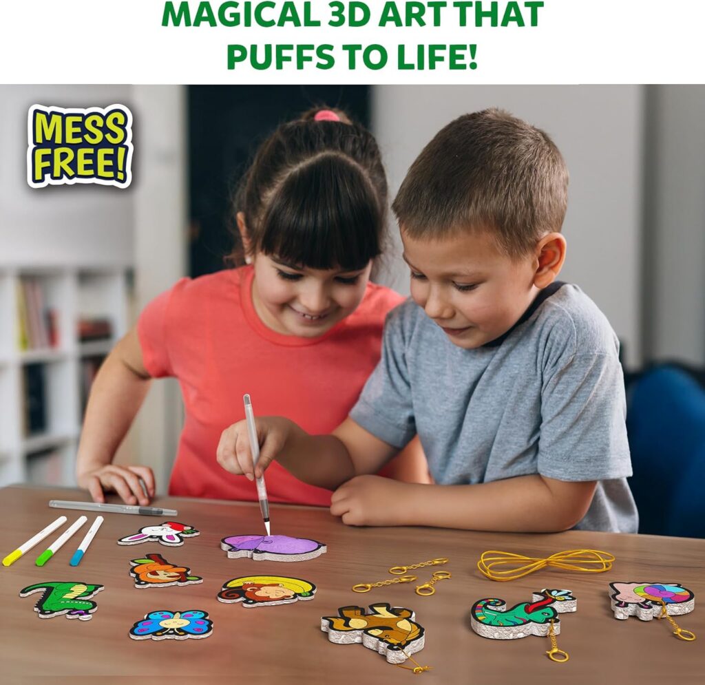 Color in adorable animal friends – then just add water and watch your creations magically puff up! Just color your design, use the water pen to activate the puff effect, and watch the magic happen in minutes. No glue, no mess – just instant puff-tastic fun!