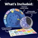 Help kids move through their evening routines and learn about time with the 6-step tracker—it’s an easy way to move from toy cleanup to baths to bedtime and more! Between each step, kids will manage transitions with the visual timer—watch the moon count up or down in 5 different time increments. Plus, the night light function counts down from 15 minutes to let kids know when it’s time to sleep!