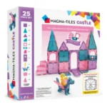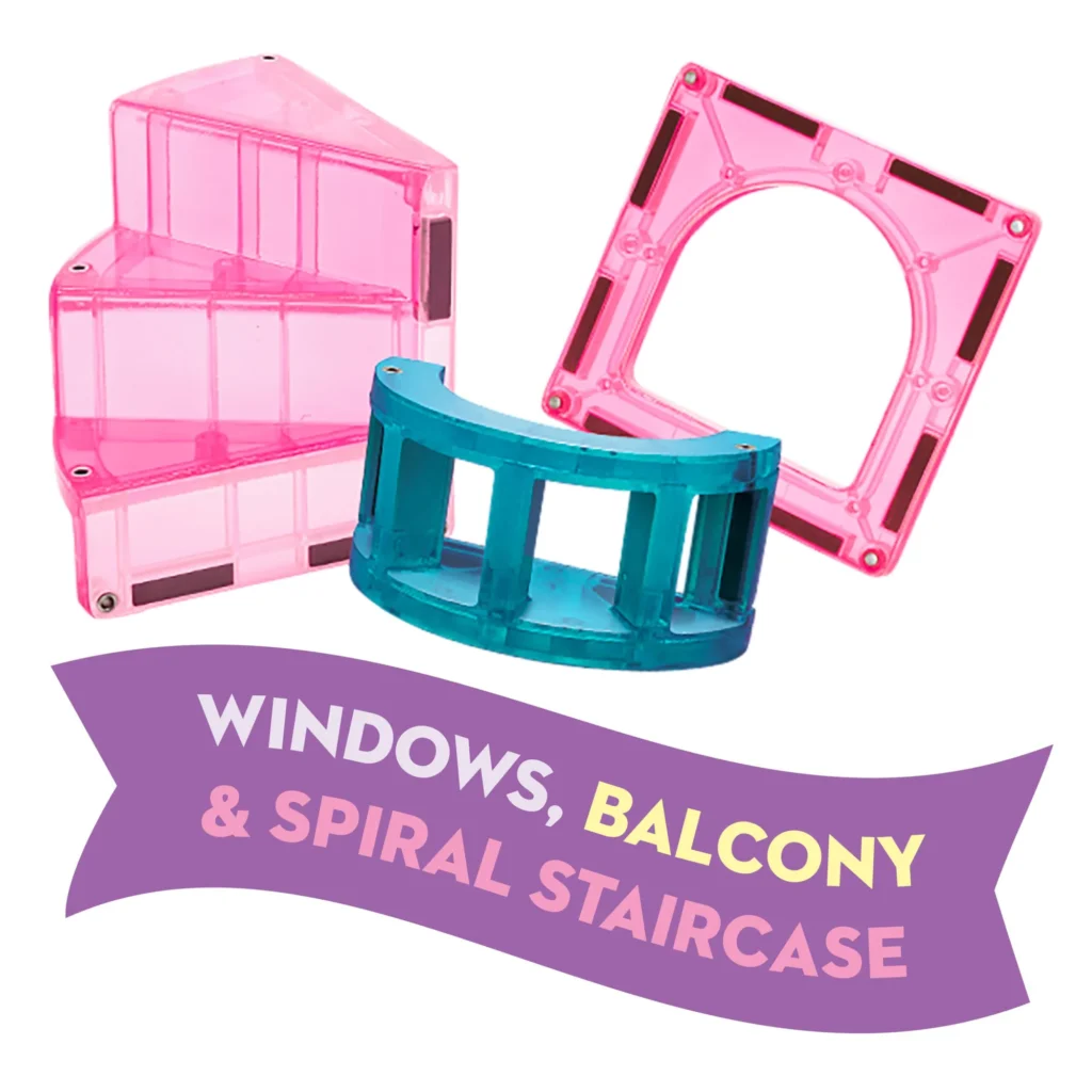 What’s Included: 25 magnetic pieces, including 1 Drawbridge, 1 Dragon Figure, 1 Royalty Figure, 1 Spiral Staircase, 1 Balcony, 2 Windows, 2 Equilateral Triangles, 2 Quarter Circles, 4 Isosceles Triangles (2 Glitter, 2 Standard) and 10 Squares (4 Glitter, 6 Standard).