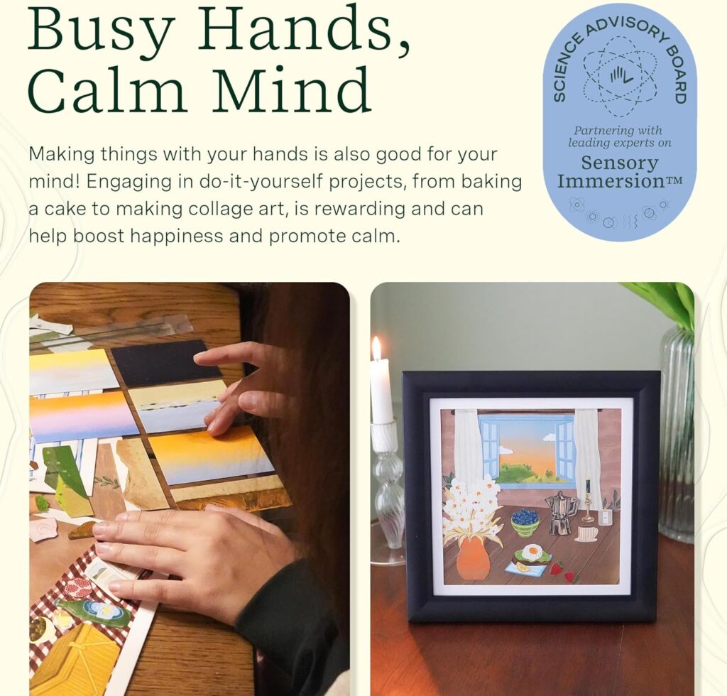 - Busy Hands, Calm Mind: Making things with your hands is also good for your mind! Engaging in do-it-yourself projects, from baking a cake to crafting a collage, is rewarding and can help boost happiness and promote calm.