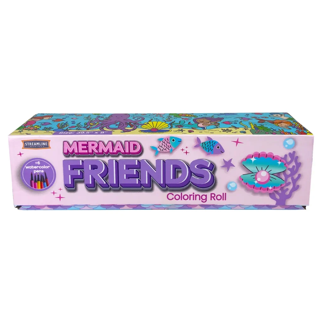 Dive into the sea with this Mermaid Friends Coloring Roll with a 6-piece marker set. This portable coloring mat is both informative and ideal for keeping little ones entertained in public. Conveniently rolls up and can be wiped and colored again with ease for endless aquatic fun!
