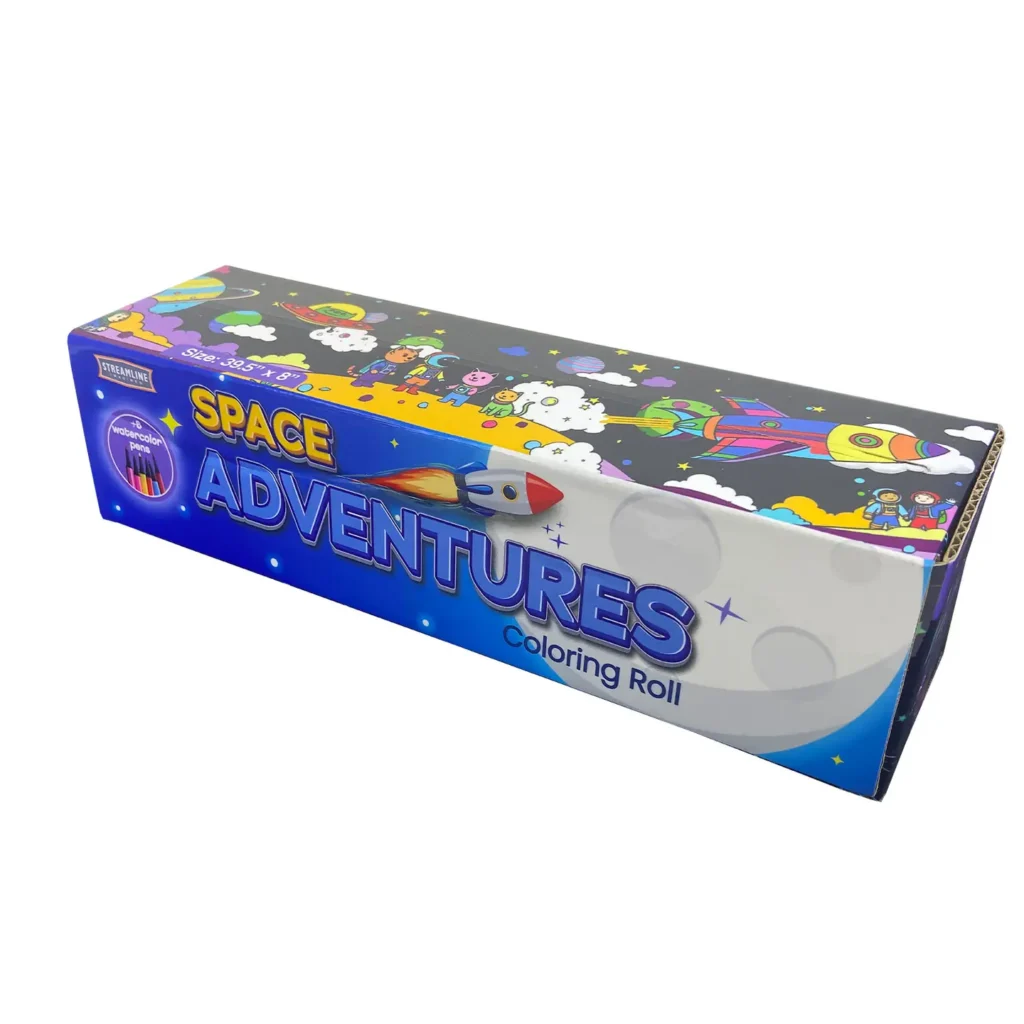 Explore outer space with this Space Adventures Coloring Roll with a 6-piece marker set. This portable coloring mat is both informative and perfect for keeping little ones entertained in public. Rolls up for convenience, and mat can be wiped and colored again with ease.
