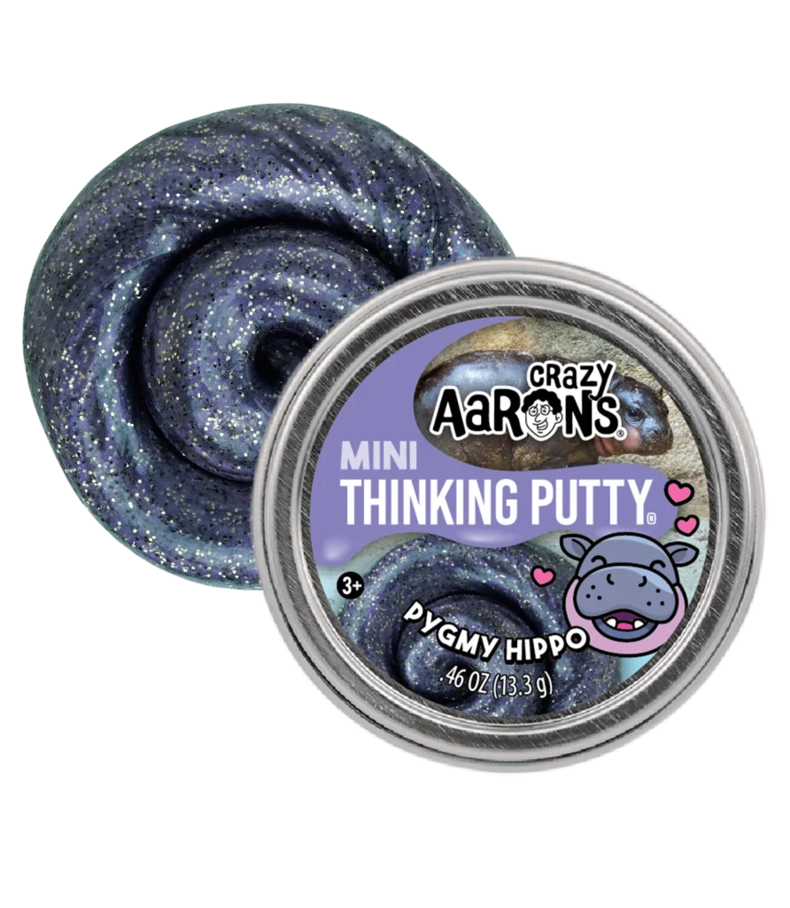 Crazy Aaron’s Pygmy Hippo Pocket Putty is tiny but mighty! Capturing the charm of these rare friends, this putty has a grayish-purple hue with a hint of silver shimmer.