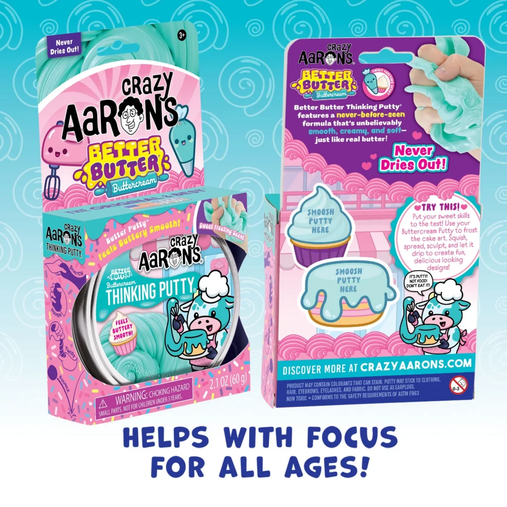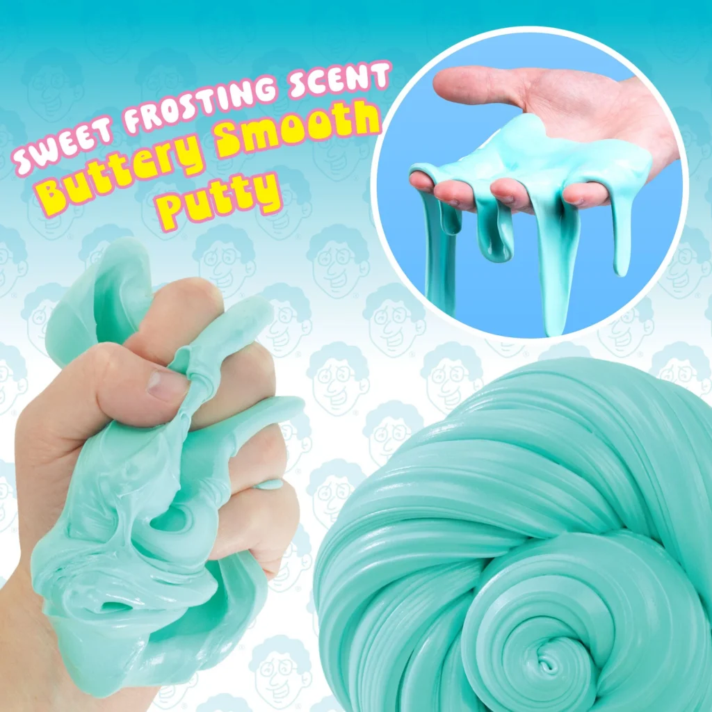 Crazy Aaron’s Buttercream Better Butter Thinking Putty feels like buttery frosting in your hands? You butter believe it! Buttercream Thinking Putty® is whipped to creamy perfection- soft, smooth, and scented sweet like frosting. Whether you’re piping away your stress or swirling up something fun, this teal putty is the perfect recipe to brighten your day.