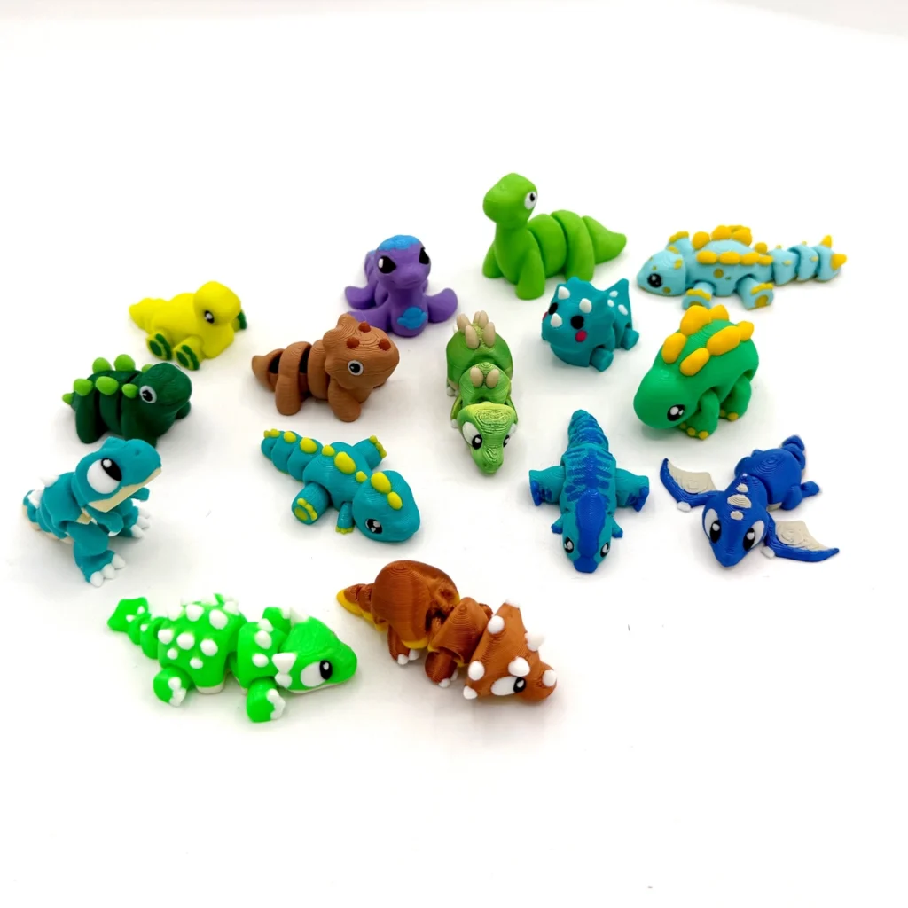 This delightful collection comes with 15 perfectly articulated miniature dino-themed 3D-printed PYE Pals ranging from 1.5 to 3 inches long, all bursting with bright colors and irresistible charm!