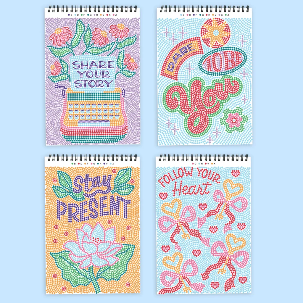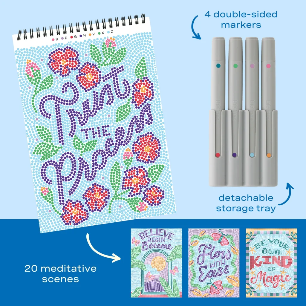 Lifelines FlowArt Pads are guided art meditations designed to help you achieve a calming flow state. Each scene is thoughtfully crafted to encourage repetitive, relaxing movements, promoting mindfulness and reducing stress. Dot-by-Letter includes 20 meditative scenes and four double-sided markers in a detachable storage tray. Engage in a meditative dotting activity using a guided letter key to fill the page with vibrant dots, creating beautiful inspirational scenes. Simply match the colors to the letters, and let the rhythmic motion of dotting bring you a sense of calm. Compact and portable, this pad is perfect for calming your mind on-the-go, unwinding before bed, or taking a work or study break to de-stress.