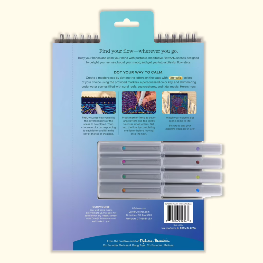 Lifelines FlowArt Pads are guided art meditations designed to help you achieve a calming flow state. Each scene is thoughtfully crafted to encourage repetitive, relaxing movements, promoting mindfulness and reducing stress. This special-edition METALLIC Dot-by-Letter includes 20 meditative scenes and four double-sided metallic markers in a detachable storage tray. Engage in a meditative dotting activity using a guided letter key to fill the page with metallic dots, creating shimmering underwater scenes filled with coral reefs, sea creatures, and tidal magic. Simply match the colors to the letters, and let the rhythmic motion of dotting bring you a sense of calm. Compact and portable, this pad is perfect for calming your mind on-the-go, unwinding before bed, or taking a work or study break to de-stress.