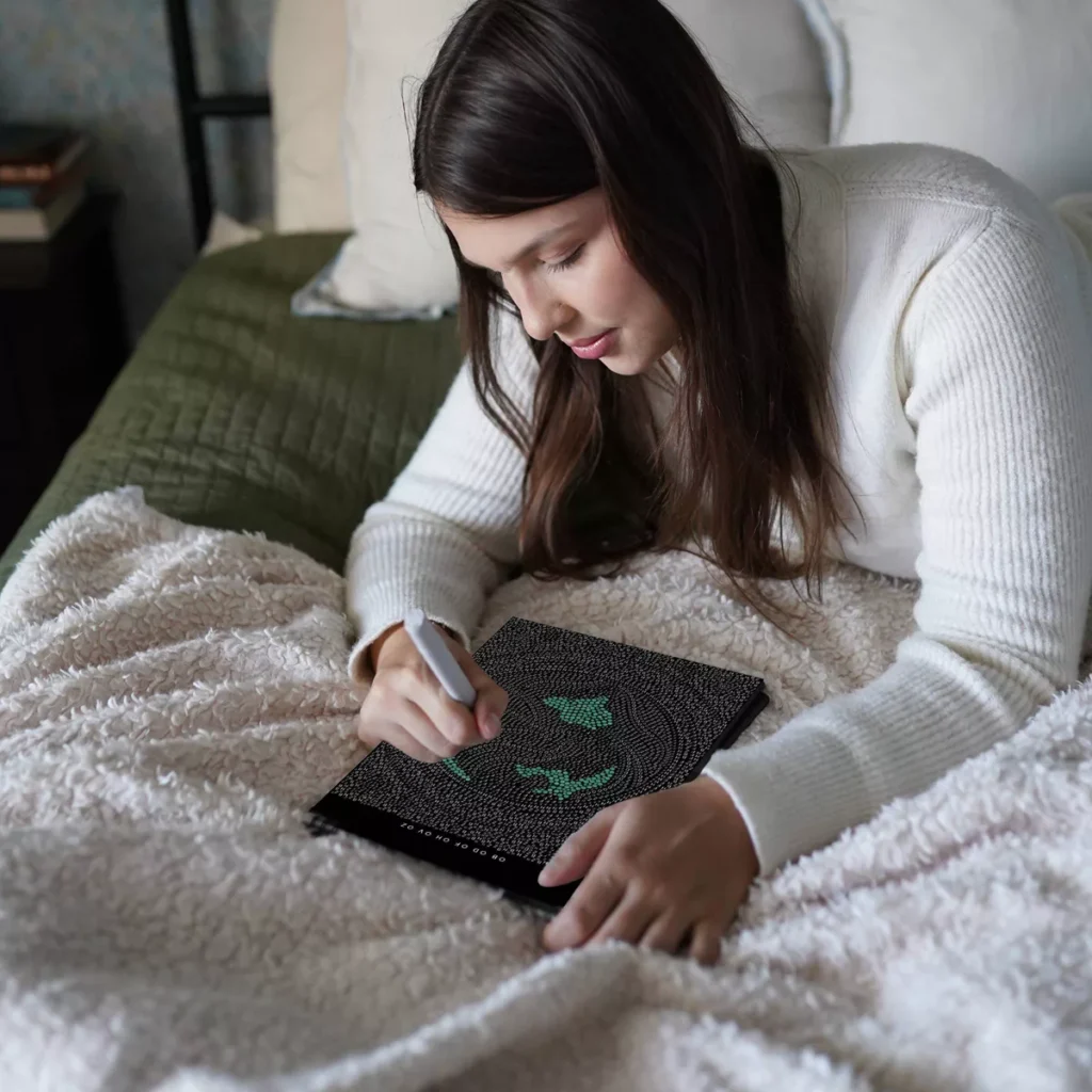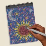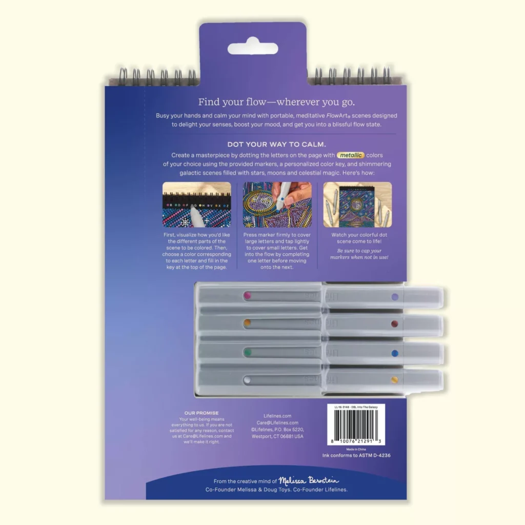 Lifelines FlowArt Pads are guided art meditations designed to help you achieve a calming flow state. Each scene is thoughtfully crafted to encourage repetitive, relaxing movements, promoting mindfulness and reducing stress. This special-edition METALLIC Dot-by-Letter includes 20 meditative scenes and four double-sided metallic markers in a detachable storage tray. Engage in a meditative dotting activity using a guided letter key to fill the page with metallic dots, creating shimmering galactic scenes filled with stars, moons, and celestial magic. Simply match the colors to the letters, and let the rhythmic motion of dotting bring you a sense of calm. Compact and portable, this pad is perfect for calming your mind on-the-go, unwinding before bed, or taking a work or study break to de-stress.