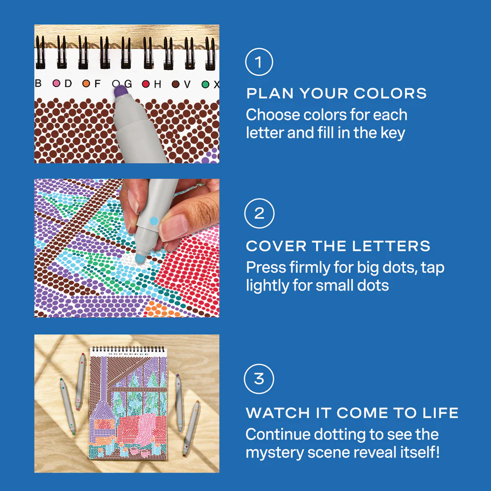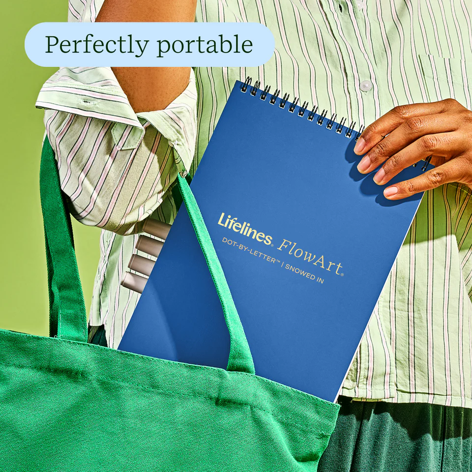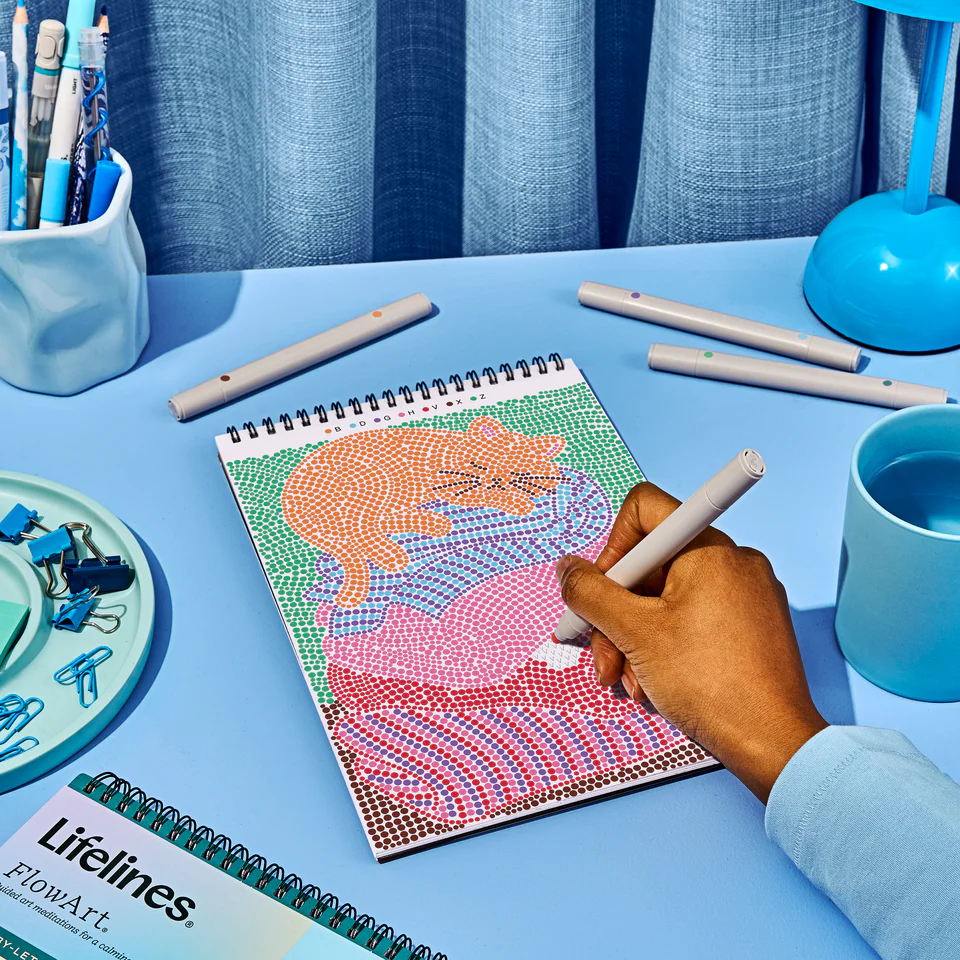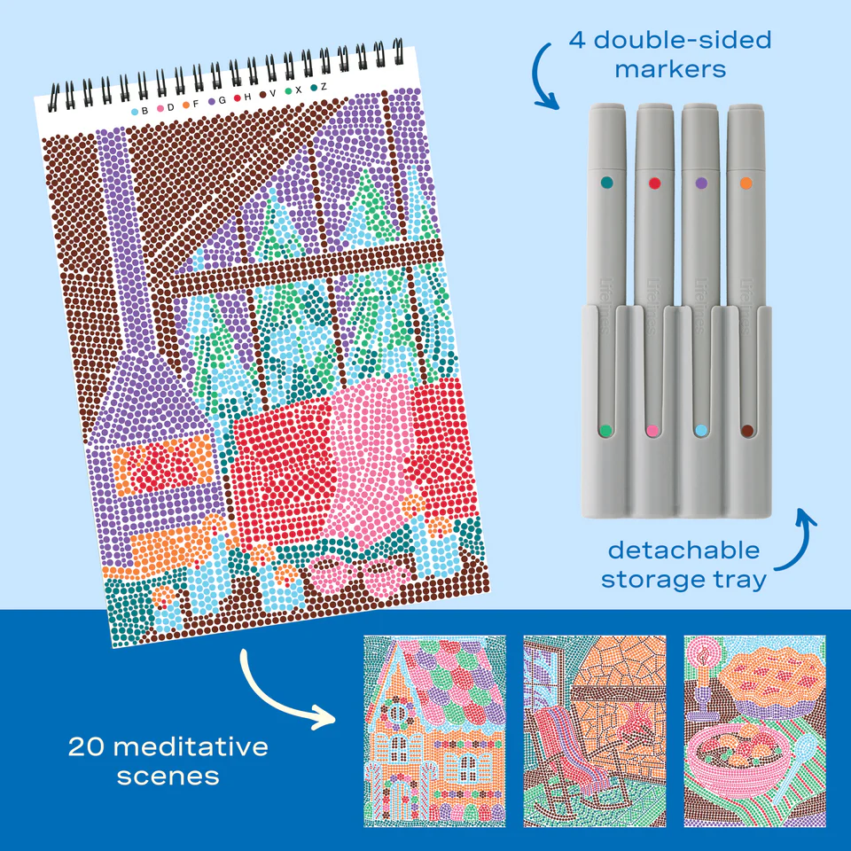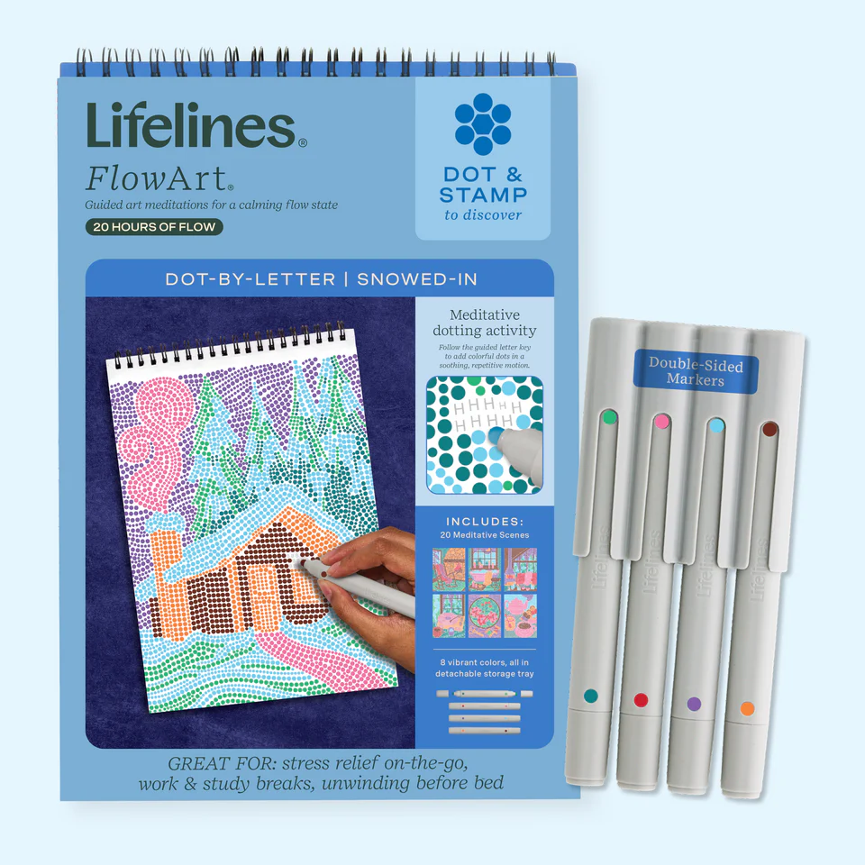 Lifelines FlowArt Pads are guided art meditations designed to help you achieve a calming flow state. Each scene is thoughtfully crafted to encourage repetitive, relaxing movements, promoting mindfulness and reducing stress. Dot-by-Letter includes 20 meditative scenes and four double-sided markers in a detachable storage tray. Engage in a meditative dotting activity using a guided letter key to fill the page with vibrant dots, creating beautiful landscape scenes. Simply match the colors to the letters, and let the rhythmic motion of dotting bring you a sense of calm. Compact and portable, this pad is perfect for calming your mind on-the-go, unwinding before bed, or taking a work or study break to de-stress.