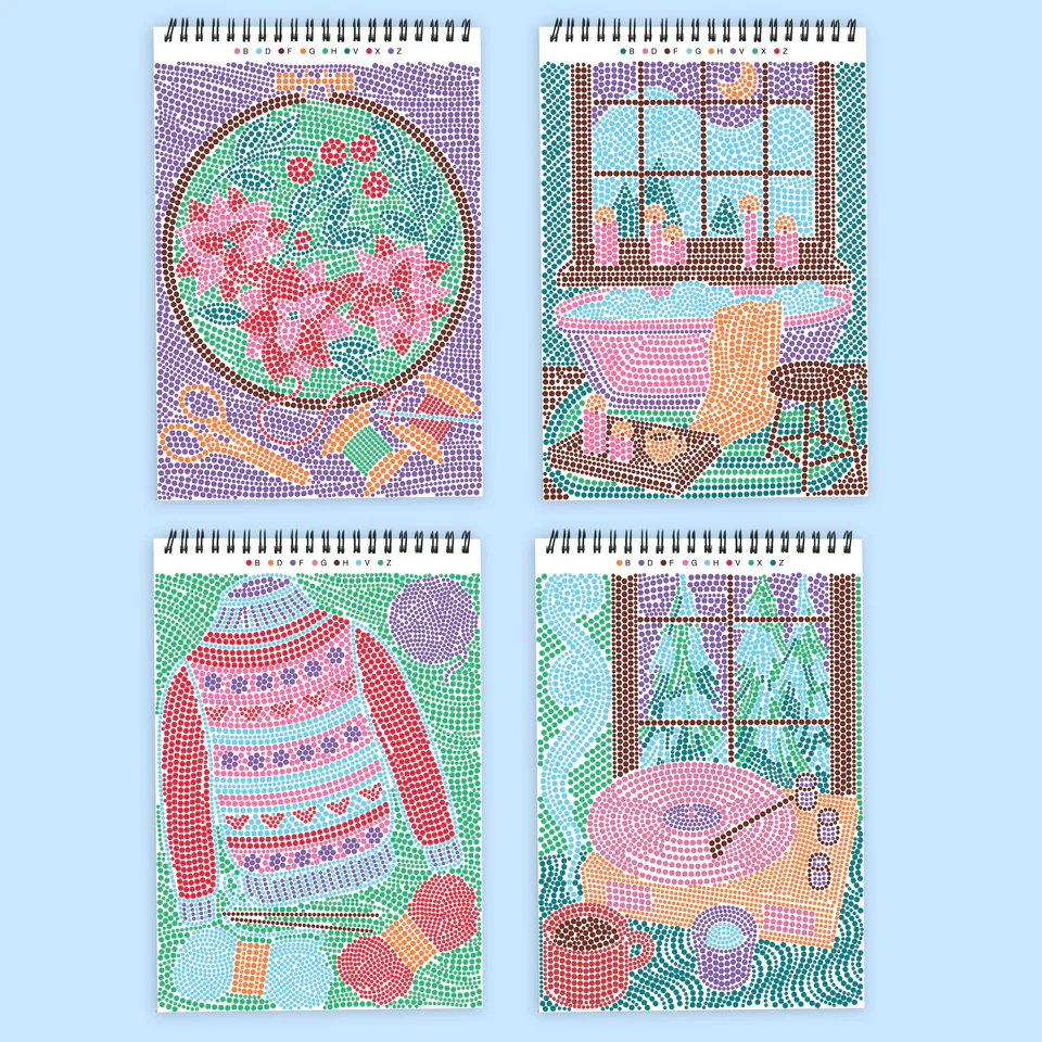 - First, choose a color for each letter and fill in the key at the top of the page. Then, follow the key to dot the letters on the page, creating delightfully cozy scenes.