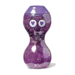 - The Silly bottle has clear liquid with miniature plastic springs, pinwheel sequins, and floating purple balls.