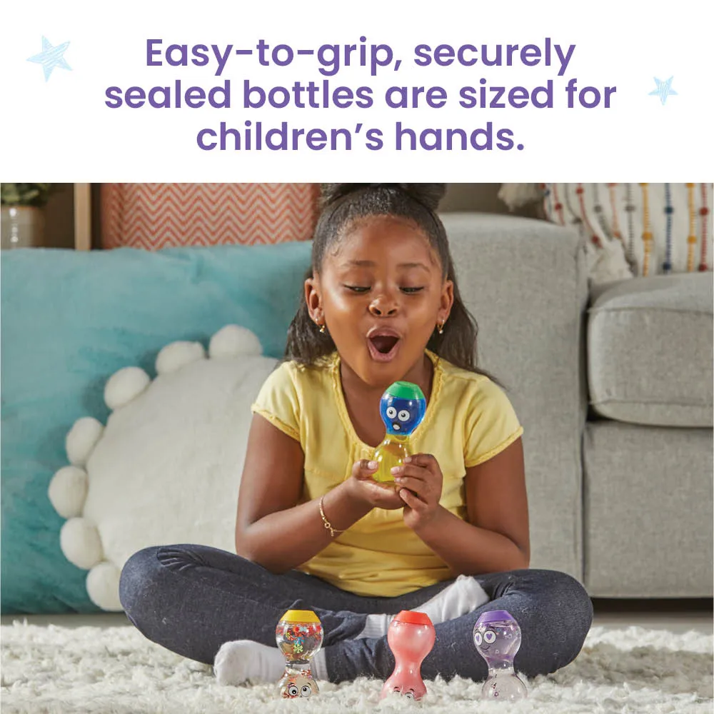 Provide children with a hands-on way to focus on and manage their feelings. Each bottle is uniquely designed with its own facial expression, color, and interactive element that embodies the feeling: Embarrassed, Silly, Surprised, and Loved. Includes 4 easy-to-grip, securely sealed bottles.