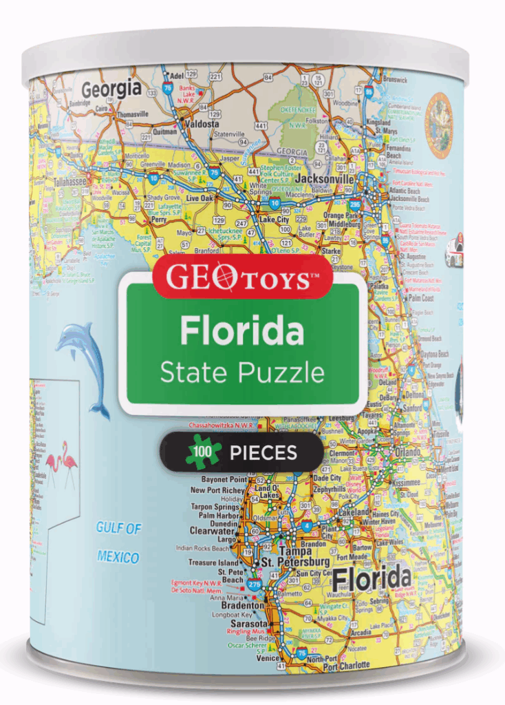 Let’s take a tour of Floida! This fun and detailed 100-piece magnetic puzzle gives you a whole new perspective on your home state by taking you deep inside Florida, with markings for major highways, parks, and landmarks. With a magnetic backing, this 13 x 10 inch jigsaw puzzle is packaged in small, adorable cans, which make the perfect gift, stocking stuffer, or easy-to-pack activity. The magnetic backing means you can put it together on your table, your refrigerator, or even on a cookie tray in the car!