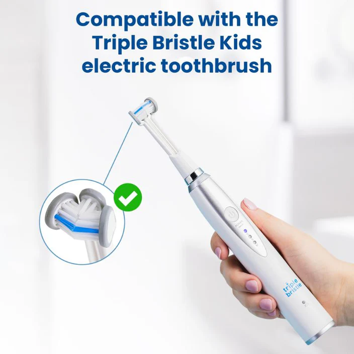 Replacement brush heads are compatible with BOTH the Triple Bristle Kids sonic toothbrush and the manual 3-sided toothbrush handles.