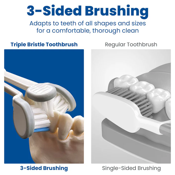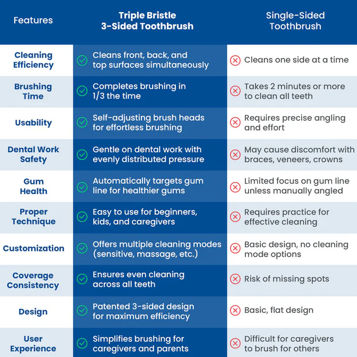Dentist designed and recommended for kids and individuals with smaller teeth and sensitive mouths – not just for kids. Rechargeable sonic toothbrush handle and compact brush head compared to the Original Triple Bristle brush head. Same oral care benefits, slightly different features. If a smaller TRIPLE-sided brush head is what you are looking for, this model is for you.