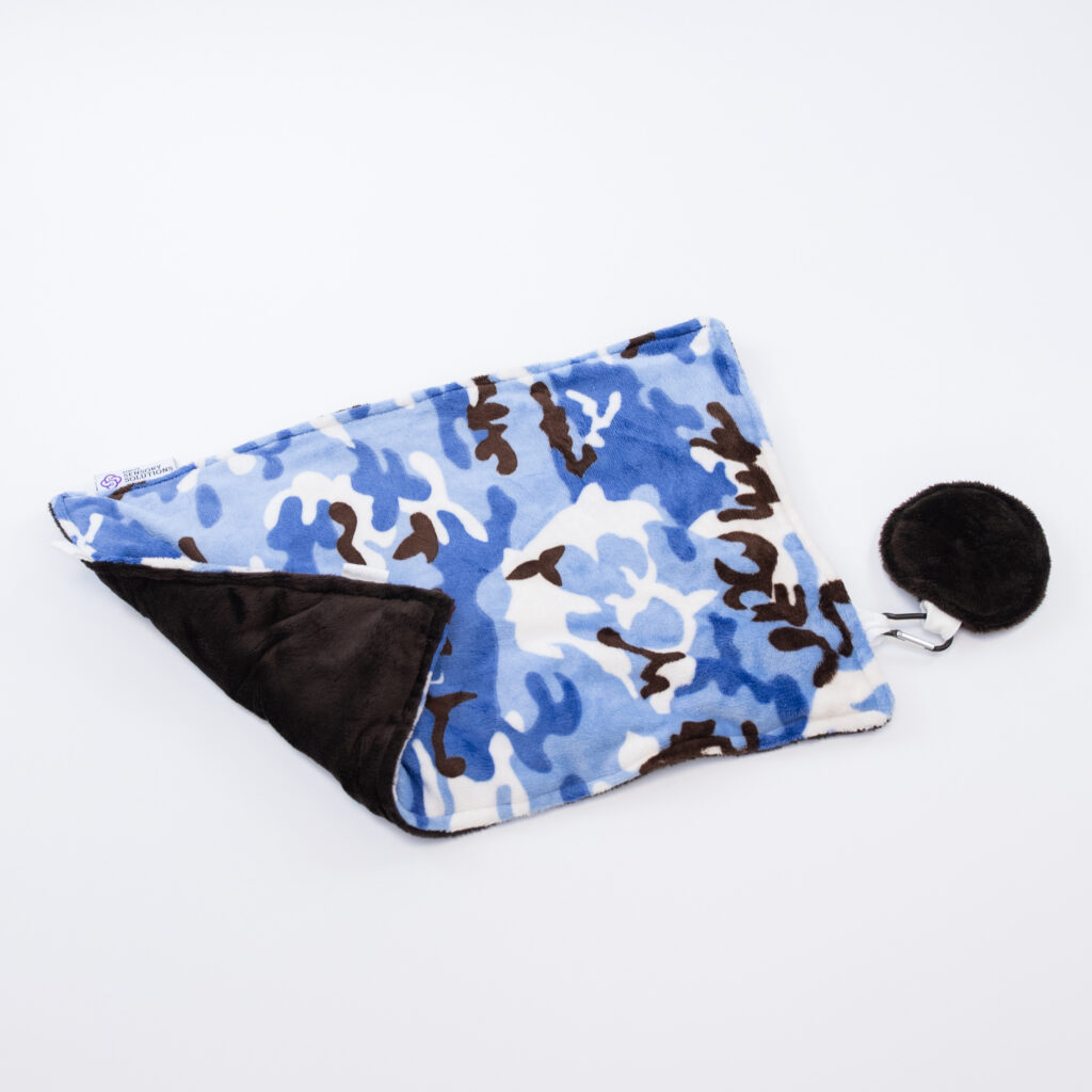 The front and back of this lap pad will feature lightly textured, super soft minky fabric. Colors on the back are black and a blue camo print on the front!