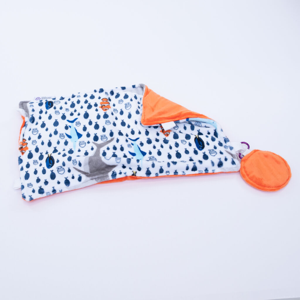 The front and back of this lap pad will feature lightly textured, super soft white with a variety of fishy friends on the front and orange minky fabric on the back!