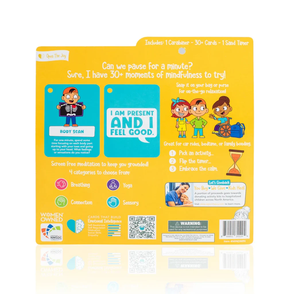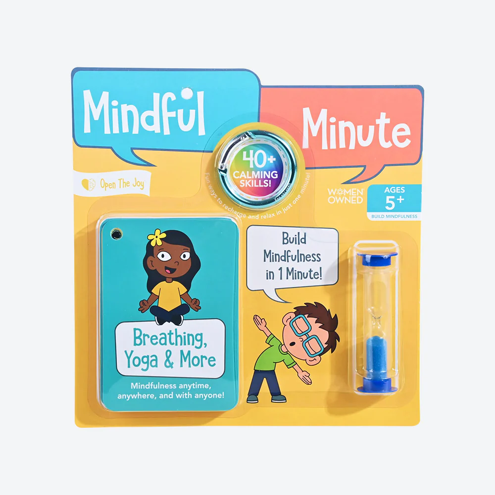 60 seconds is all it takes to settle big emotions and pacify hectic moments with Open The Joy’s Mindful Minute Cards. Each card teaches a simple calming activity such as yoga poses, rhythmic breathing and grounding exercises, each accompanied by an uplifting quote to keep kids feeling cool, calm and confident. Designed for convenience, the set includes a 1-minute sand timer and a carabiner ring to keep the cards organized and ready for on-the-go practice. Perfect for busy families looking to incorporate quick, positive pauses into their daily routine, these cards prove that a minute of mindfulness can make all the difference in a child’s mood and mindset.