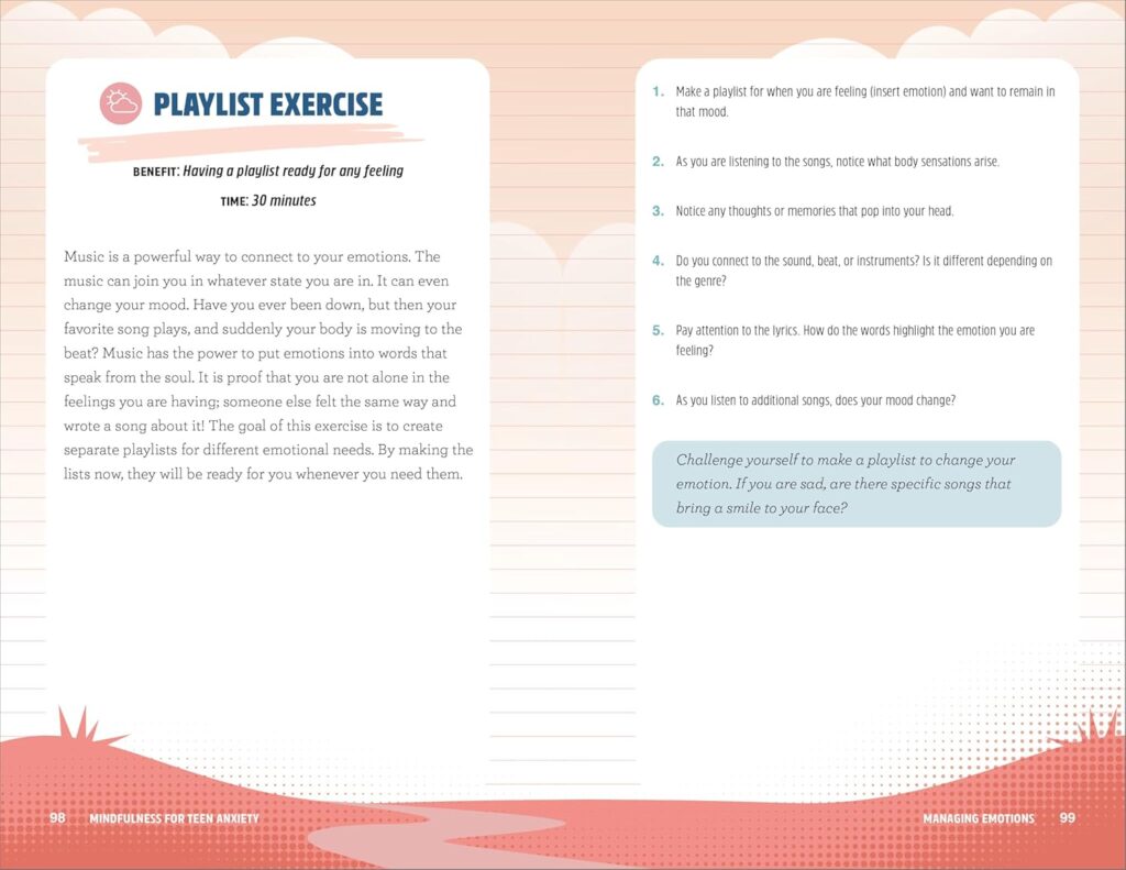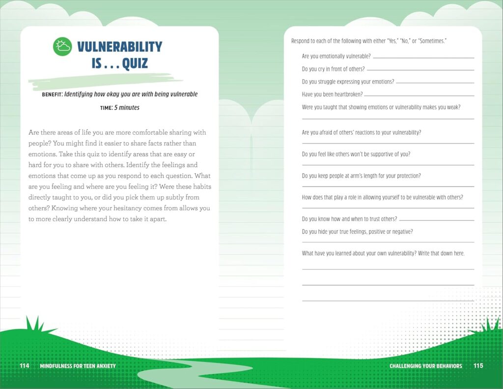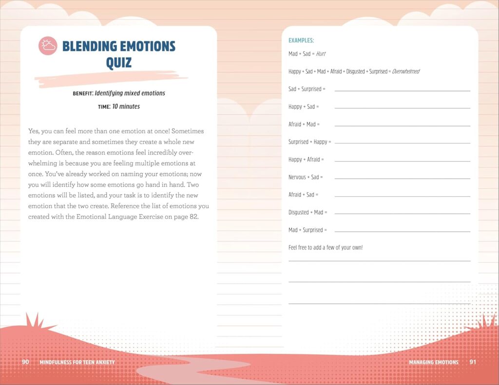 - A variety of exercises―From short quizzes to creative activities, this book is filled with exercises to help teens be more present, check in on themselves, and change their thoughts.