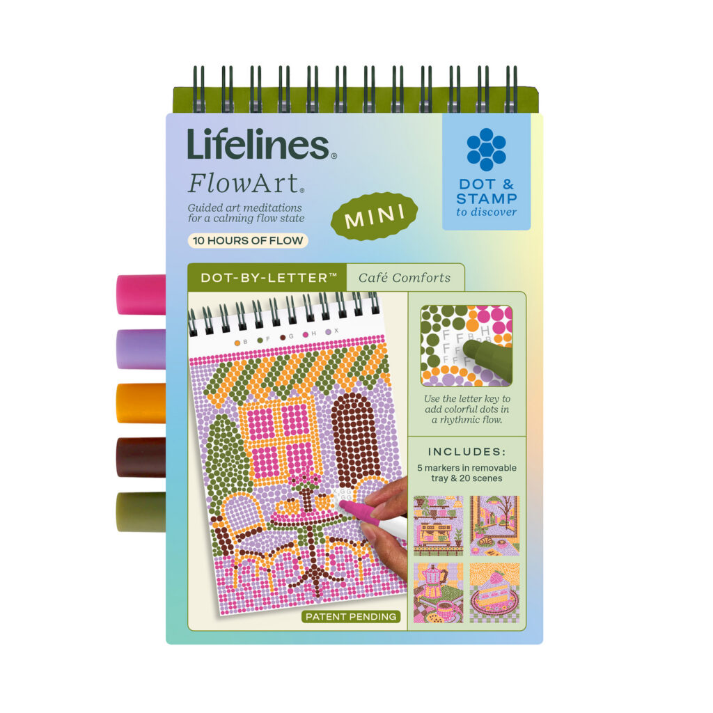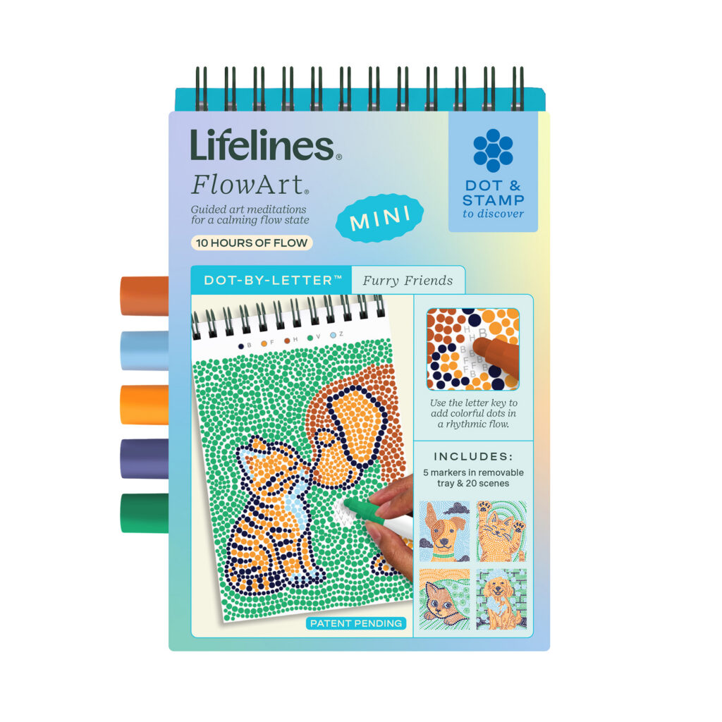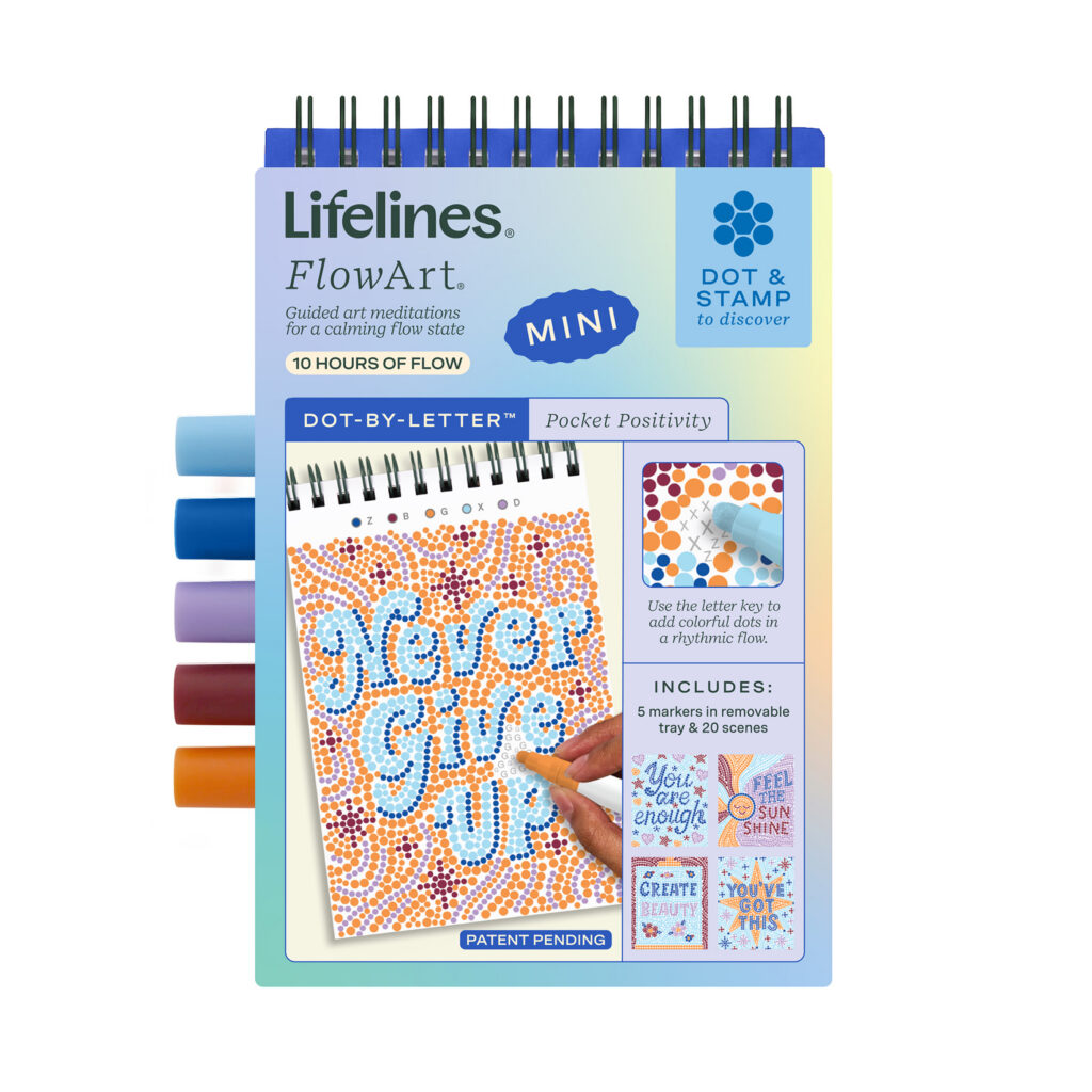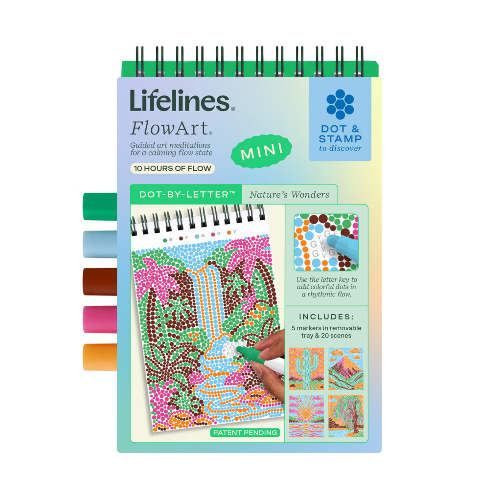 Lifelines FlowArt Pads are guided art meditations designed to help you achieve a calming flow state. Each scene is thoughtfully crafted to encourage repetitive, relaxing movements, promoting mindfulness and reducing stress. Each Dot-by-Letter includes 20 meditative scenes and five markers in a detachable storage tray. Engage in a meditative dotting activity using a guided letter key to fill the page with vibrant dots, creating beautiful scenes. Simply match the colors to the letters, and let the rhythmic motion of dotting bring you a sense of calm. Compact and portable, this pad is perfect for calming your mind on-the-go, unwinding before bed, or taking a work or study break to de-stress.