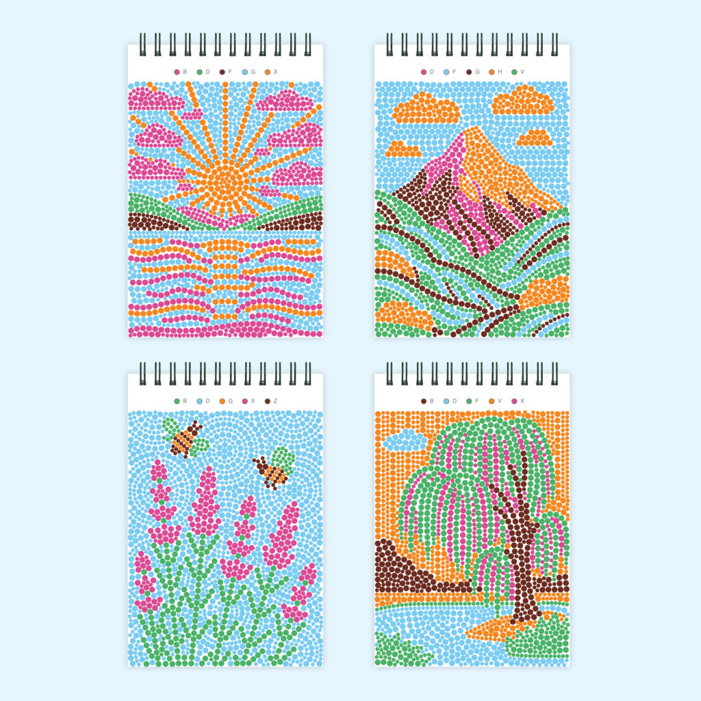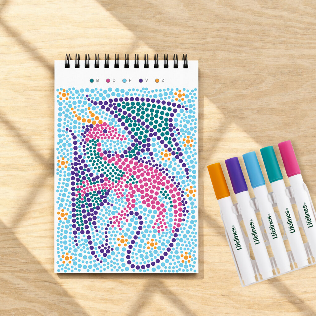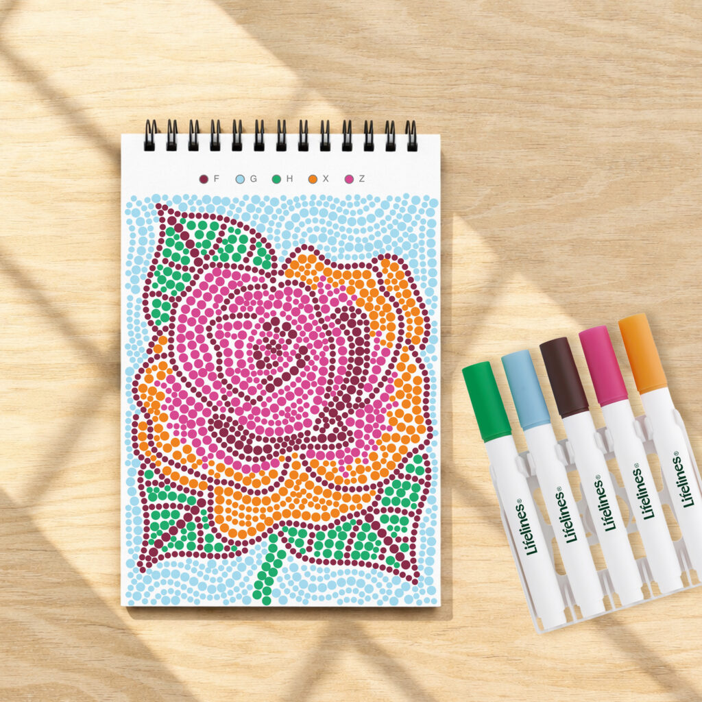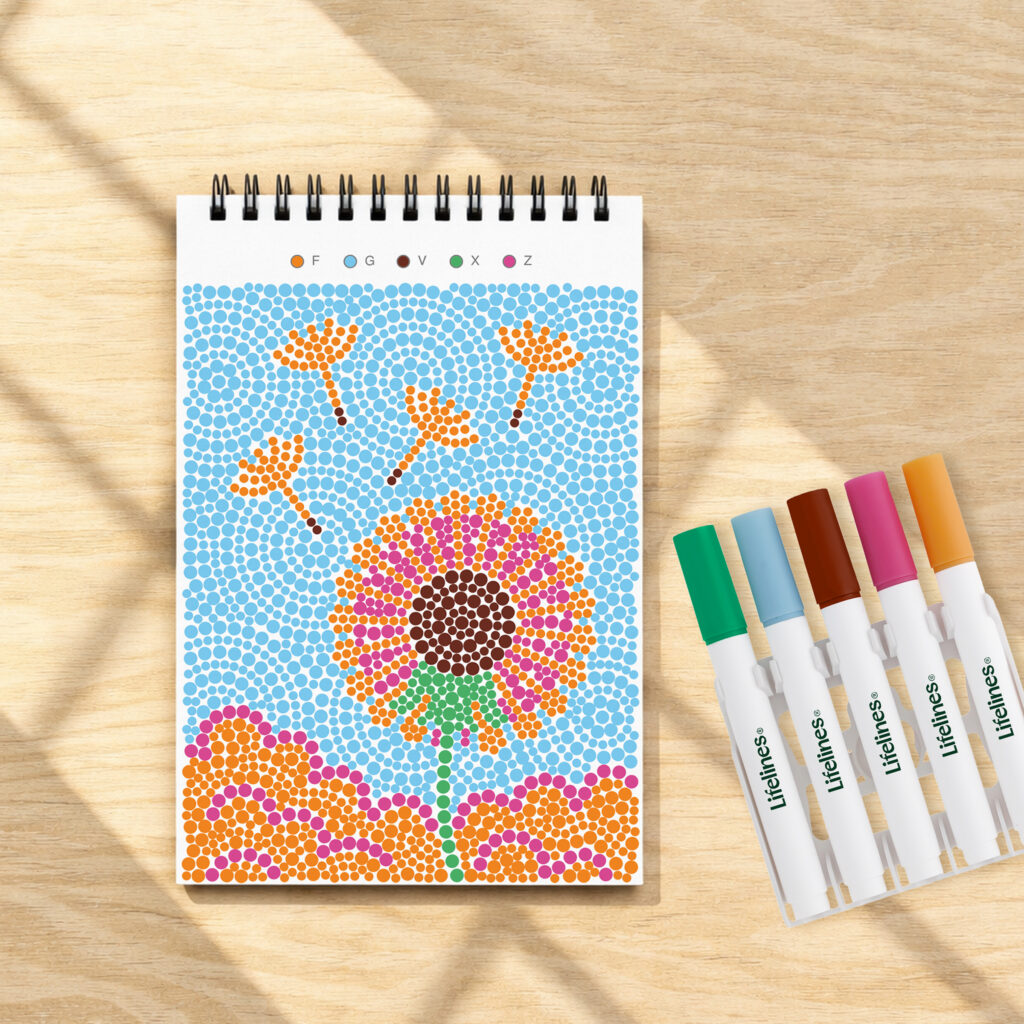 Lifelines FlowArt Pads are guided art meditations designed to help you achieve a calming flow state. Each scene is thoughtfully crafted to encourage repetitive, relaxing movements, promoting mindfulness and reducing stress. Each Dot-by-Letter includes 20 meditative scenes and five markers in a detachable storage tray. Engage in a meditative dotting activity using a guided letter key to fill the page with vibrant dots, creating beautiful scenes. Simply match the colors to the letters, and let the rhythmic motion of dotting bring you a sense of calm. Compact and portable, this pad is perfect for calming your mind on-the-go, unwinding before bed, or taking a work or study break to de-stress.