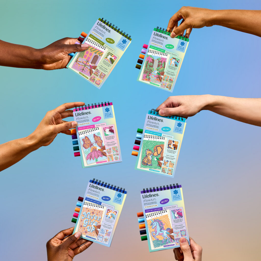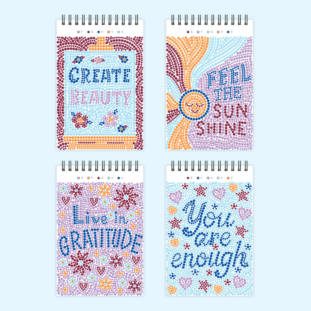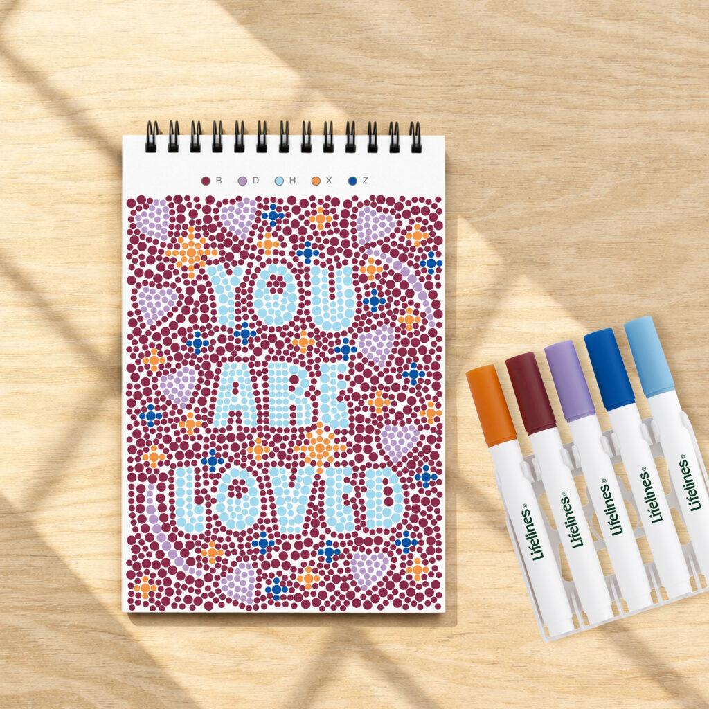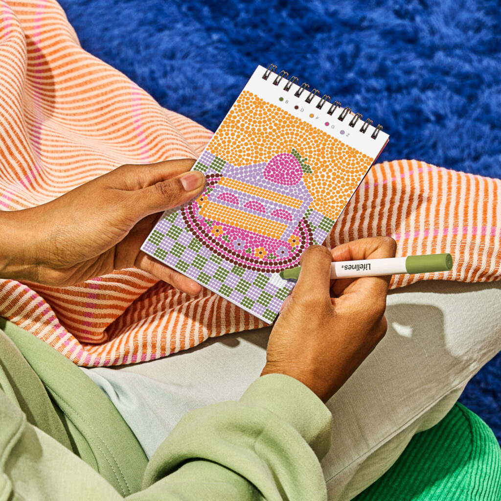 Lifelines FlowArt Pads are guided art meditations designed to help you achieve a calming flow state. Each scene is thoughtfully crafted to encourage repetitive, relaxing movements, promoting mindfulness and reducing stress. Each Dot-by-Letter includes 20 meditative scenes and five markers in a detachable storage tray. Engage in a meditative dotting activity using a guided letter key to fill the page with vibrant dots, creating beautiful scenes. Simply match the colors to the letters, and let the rhythmic motion of dotting bring you a sense of calm. Compact and portable, this pad is perfect for calming your mind on-the-go, unwinding before bed, or taking a work or study break to de-stress.
