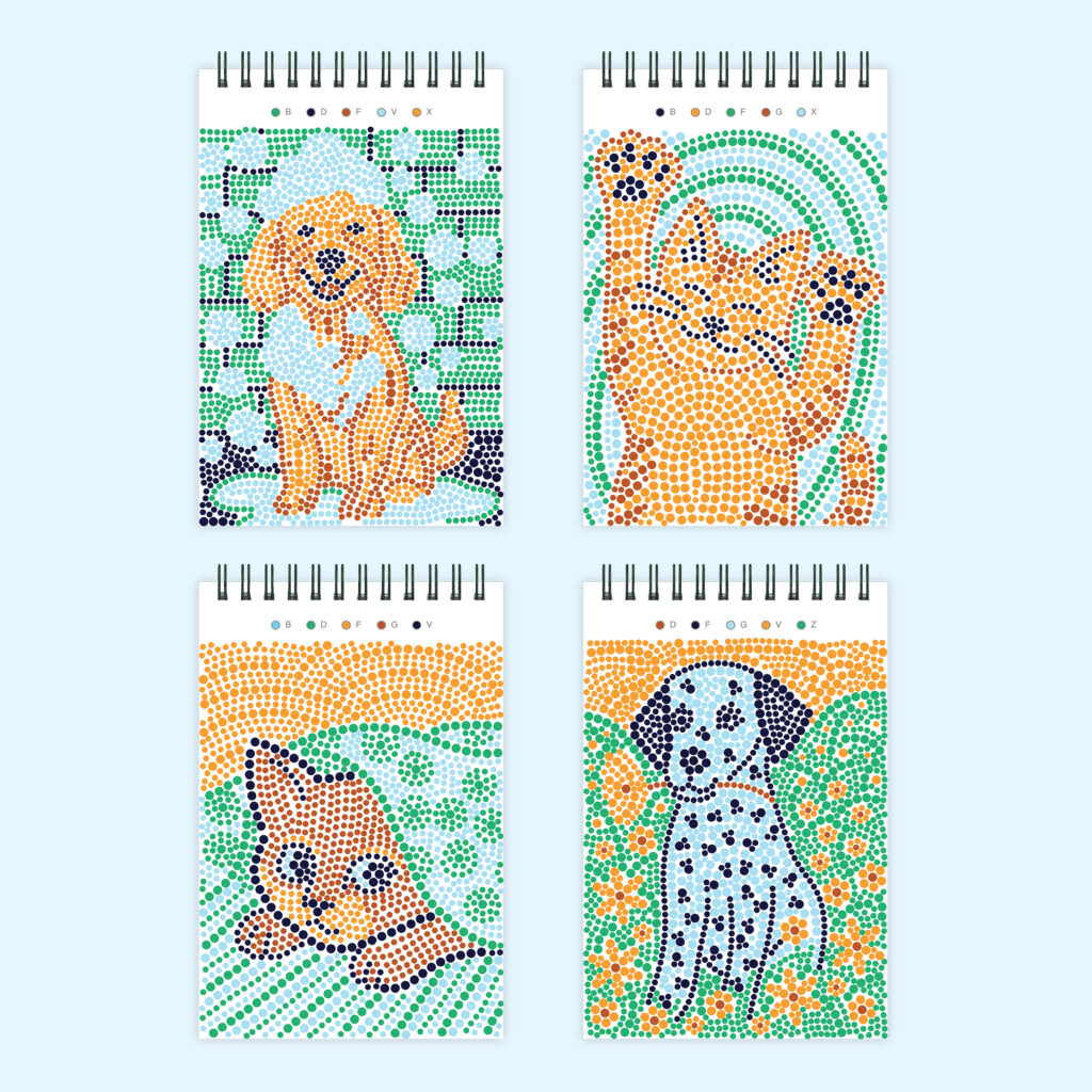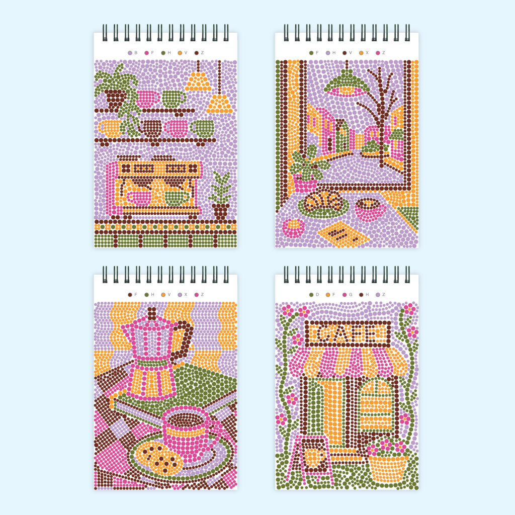 - First, choose a color for each letter and fill in the key at the top of the page. Then, follow the key to dot the letters on the page, creating delightfully cozy scenes.