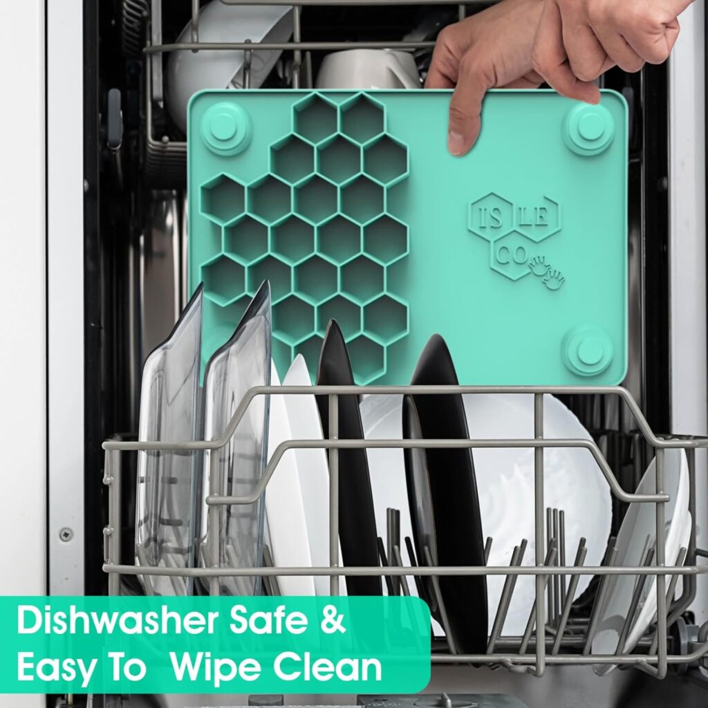 The mat also has a suction cup in each corner so it can easily stick to the table without slipping, sliding, or spilling. It is made with non-toxic, food-grade silicone, is dishwasher safe, and comes with its own cleaning brush!