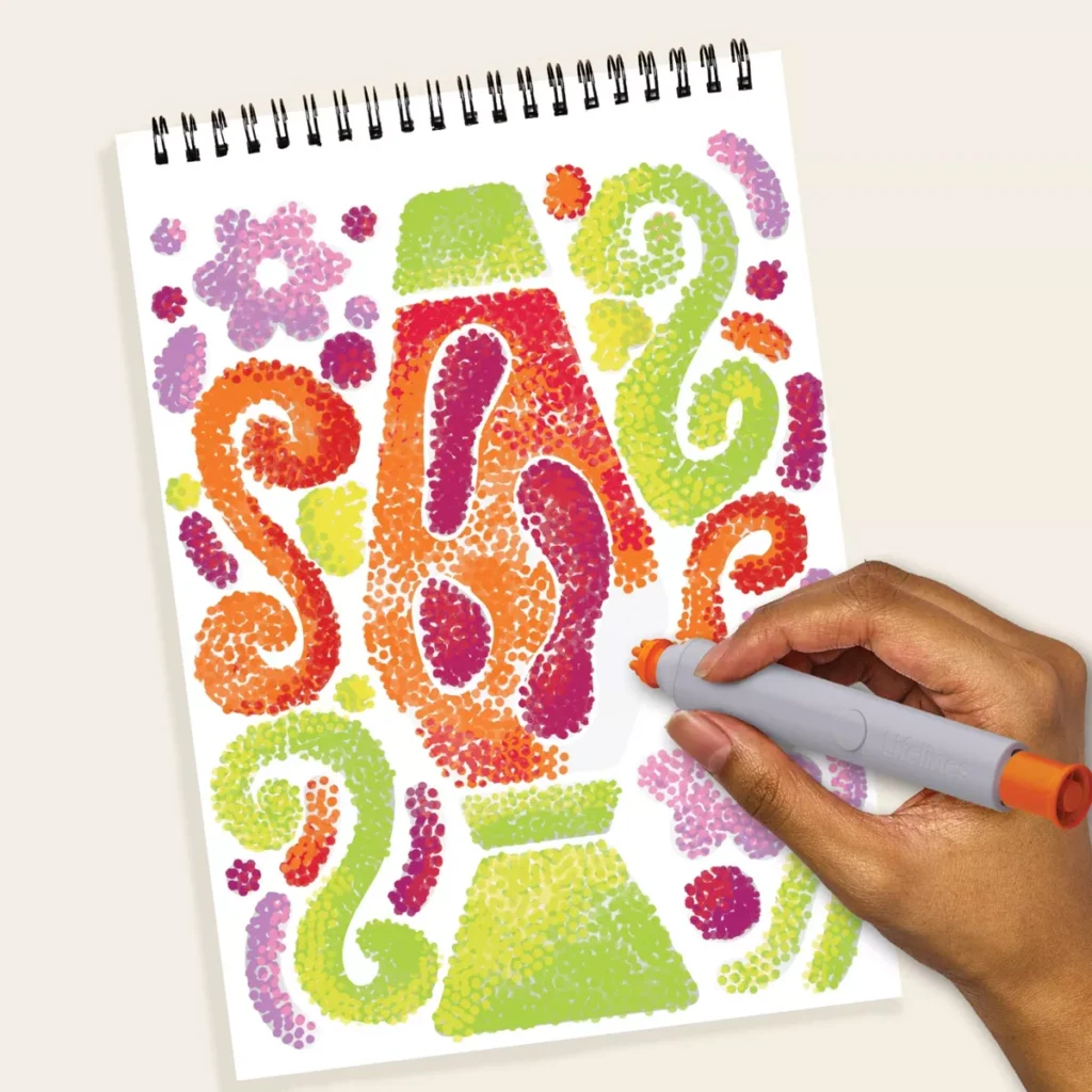 Lifelines FlowArt Pads are guided art meditations designed to help you achieve a calming flow state. Each scene is thoughtfully crafted to encourage repetitive, relaxing movements, promoting mindfulness and reducing stress. Pogo-Dot includes 20 meditative scenes and an innovative “pogo” marker with 4 interchangeable colors and 1 color-changing ink, all in a detachable storage tray. With each press, the delightfully bouncy pen adds multiple dots and gives a satisfying bounce-back. Layer dots to fill the page, creating a beautifully textured, dimensional scene; and, add color-changing ink to transform dots into new colors for a striking 3D effect. Compact and portable, this pad is perfect for calming your mind on-the-go, unwinding before bed, or taking a work or study break to de-stress.