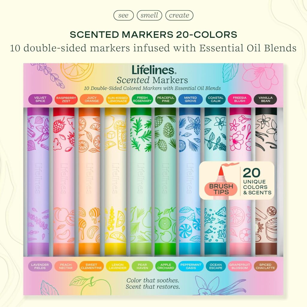 - Lifelines Scented Colored Markers (Brush Tips): Experience color that soothes and scent that restores. Uncap 10 double-sided markers and discover 20 uniquely blended scents and colors. Each colored marker features a brush tip and is infused with an Essential Oil Blend, turning doodling, journaling, and coloring into a sensory experience that calms your mind and sparks creativity. 20-Color Set.