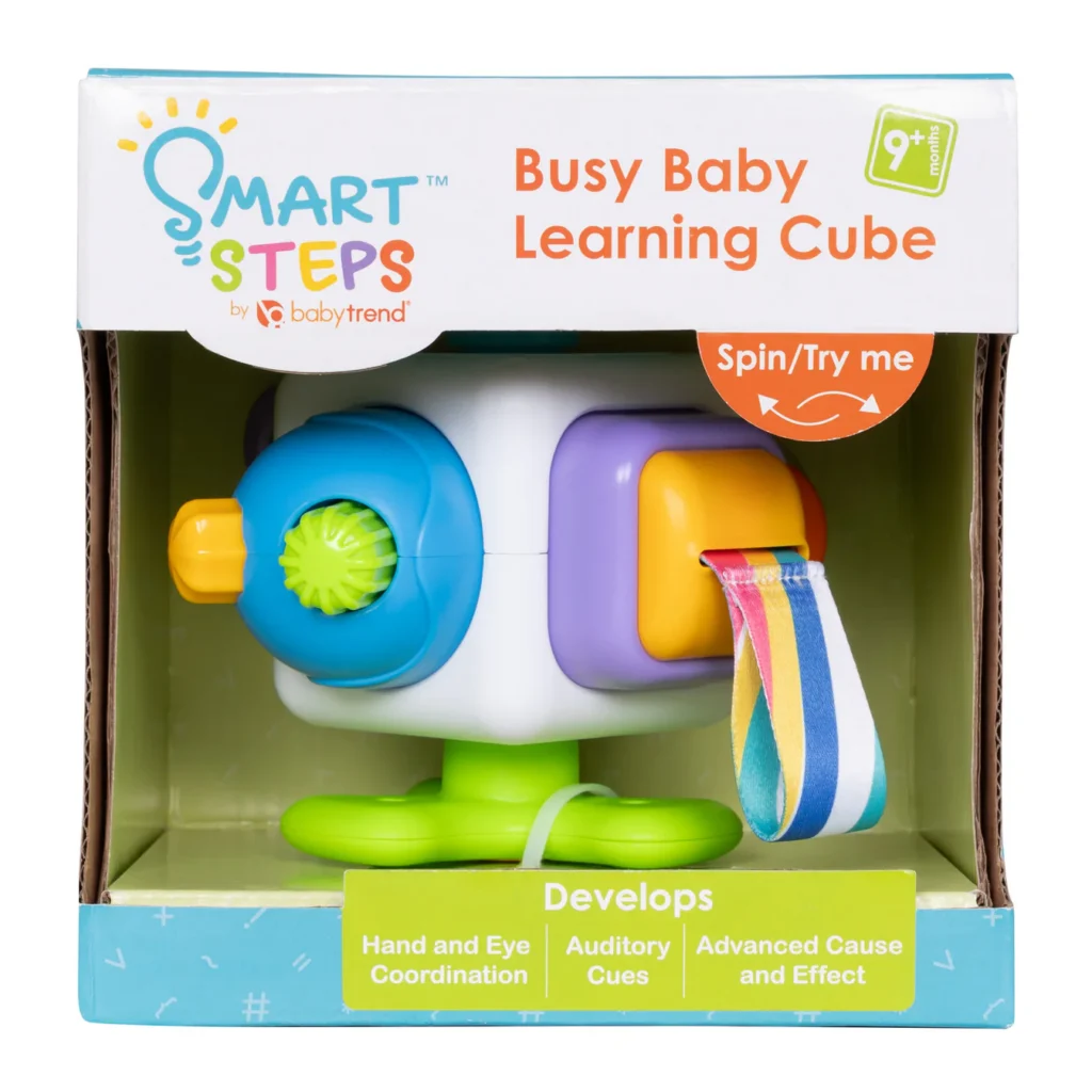 The Smart Steps Busy Baby Learning Cube is the smart way to keep your little one entertained at home and on the go! This STEM-based learning toy captivates the attention of your child with six unique mechanical activations, which helps promote cause and effect learning and cognitive development. The vibrant colors provide visual cues, and the noise activations stimulate auditory development. Keep your baby busy with the Busy Baby Learning Cube!