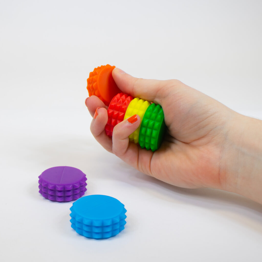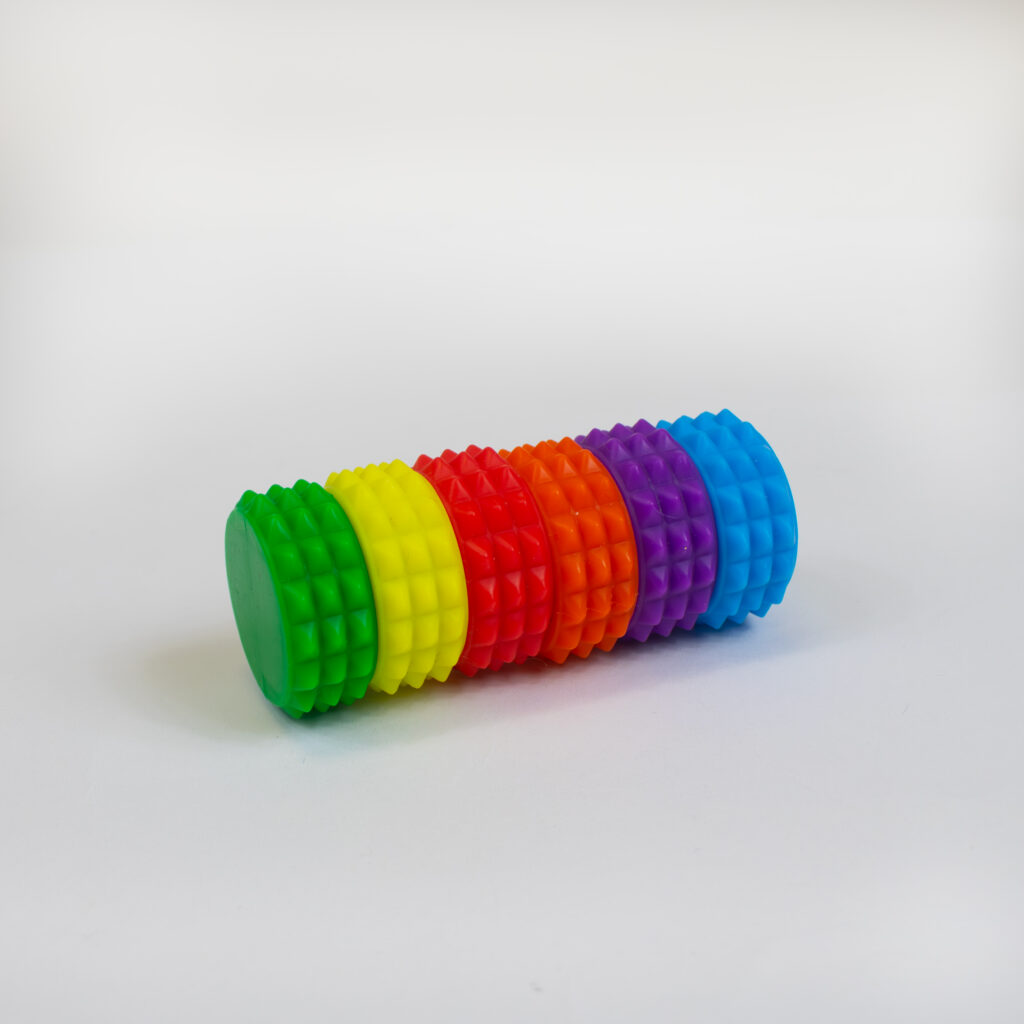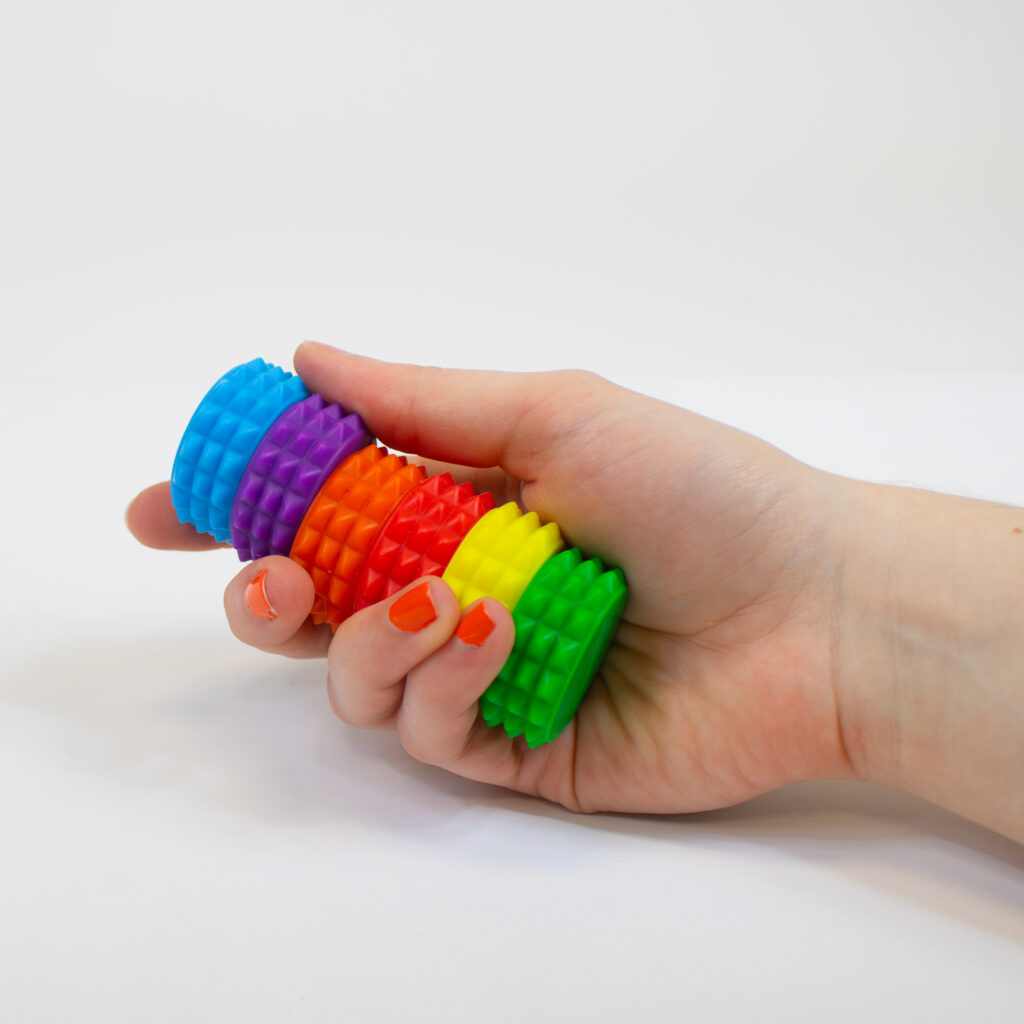 These 6 rainbow silicone magnets stack with a smooth, satisfying snap. The textured edges make this fidget also good for holding and squeezing. A playful fidget toy that’s fun to build, flip, and fiddle with.