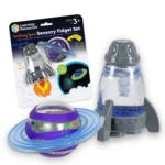 Discover an out-of-this-world way to fidget while building sensory skills! This set of two awesome astro sensory tools comes with multiple ways to fidget—spin the fidgety planet sphere, listen to the moon rocks rattle, and find the hidden alien, or peer through the fidget rocket’s glitter to spot the astronaut inside. This set’s surprises don’t stop there—twist the rocket’s top for a fun clicking sound, then turn the lights off and discover glow-in-the-dark elements! These one-piece fidgets are ready for on-the-go play.
