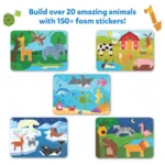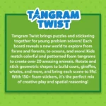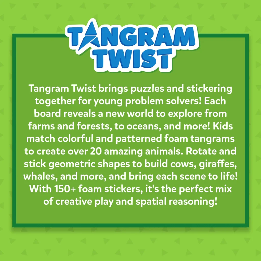 Tangram Twist brings puzzles and stickers together for young problem solvers! Each board opens a new world to explore – farms, forests, oceans, and beyond. With over 20 animals to create, kids can match, rotate, and stick colorful foam tangrams to build cows, giraffes, whales, and more, bringing every scene to life!