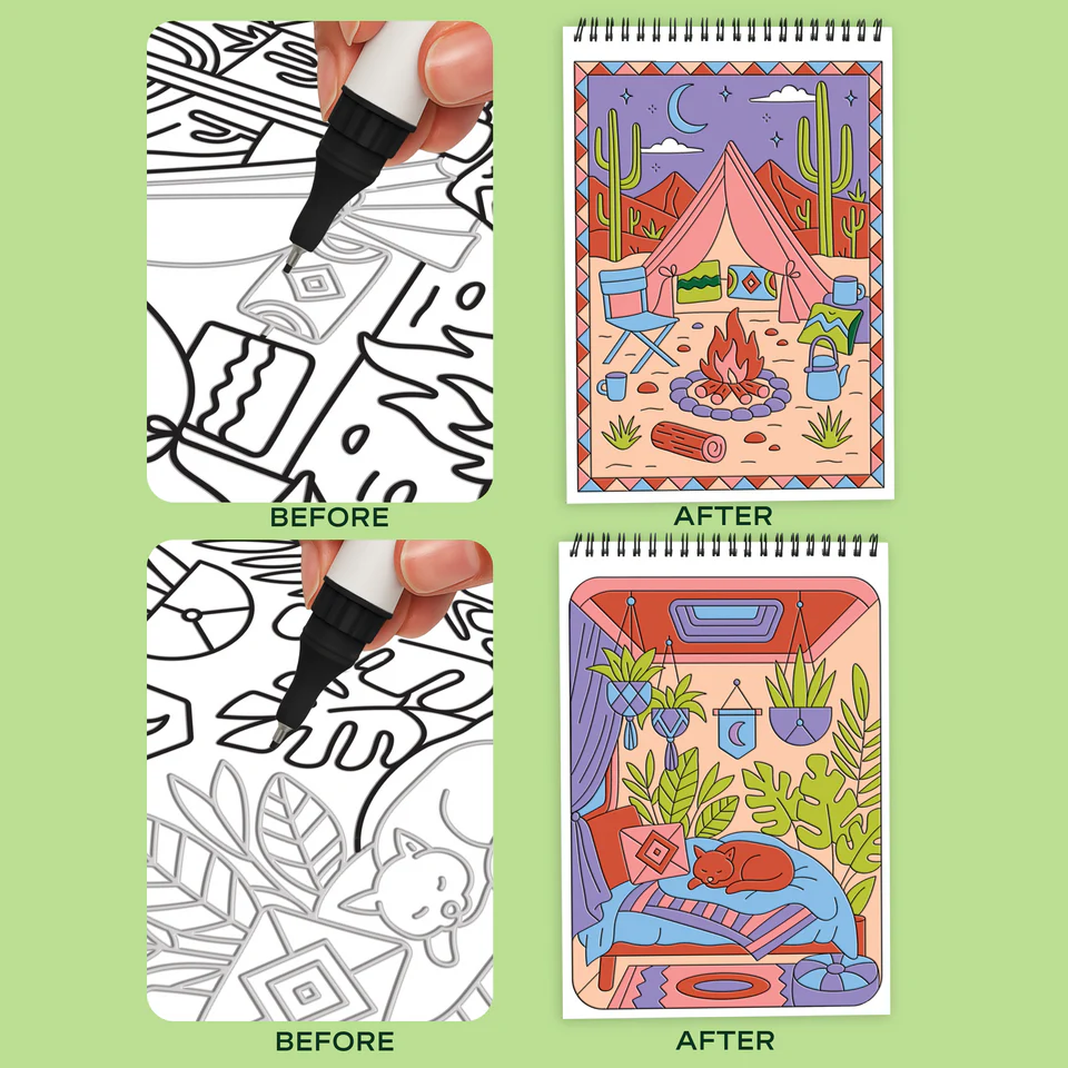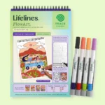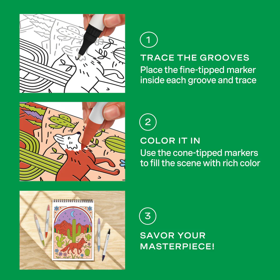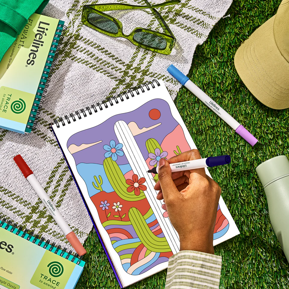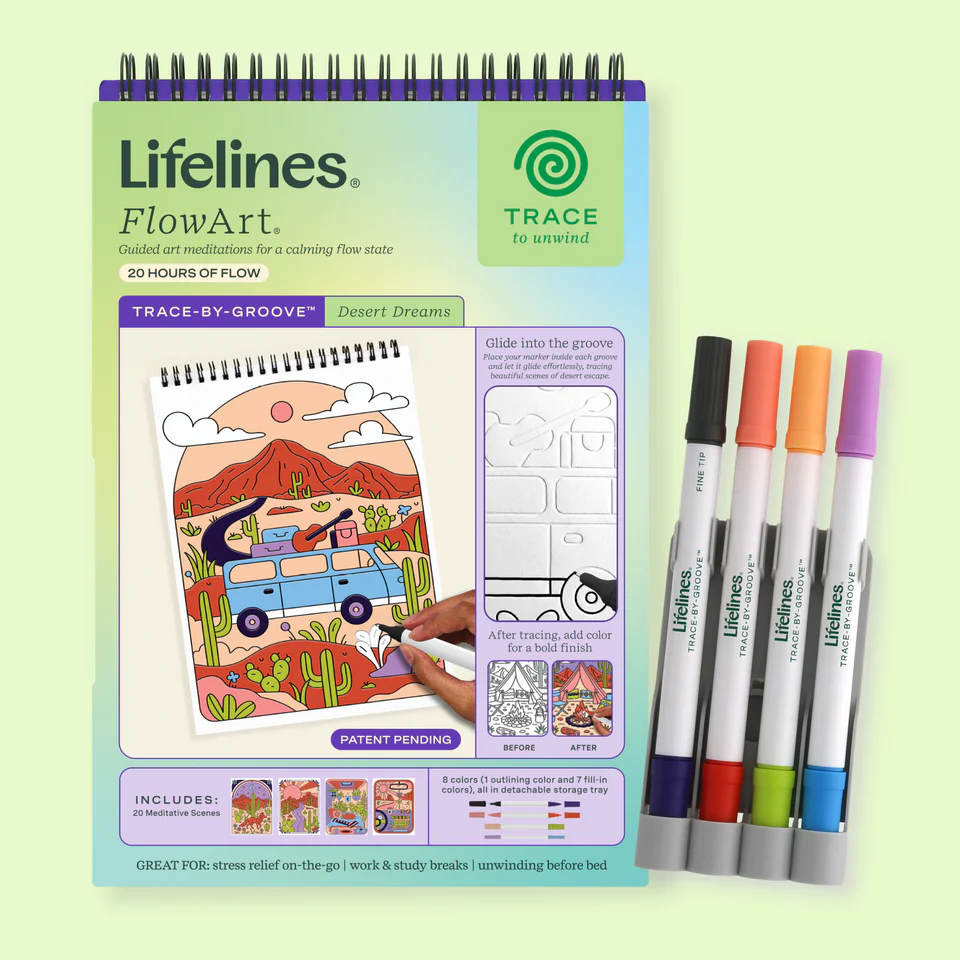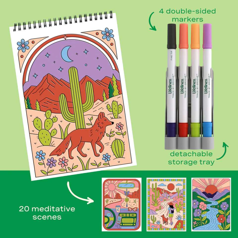 Lifelines FlowArt Pads are guided art meditations designed to help you achieve a calming flow state. Each scene is thoughtfully crafted to encourage repetitive, relaxing movements, promoting mindfulness and reducing stress. Trace-by-Groove includes 20 meditative scenes and four double-sided markers in a detachable storage tray. Engage in a meditative tracing activity by tracing the grooves then filling them in with vibrant color, creating beautiful desert scenes. Let the rhythmic motion of tracing bring you a sense of calm. Compact and portable, this pad is perfect for calming your mind on-the-go, unwinding before bed, or taking a work or study break to de-stress.