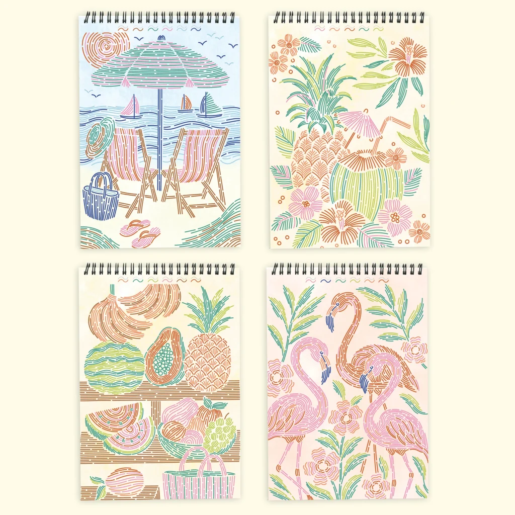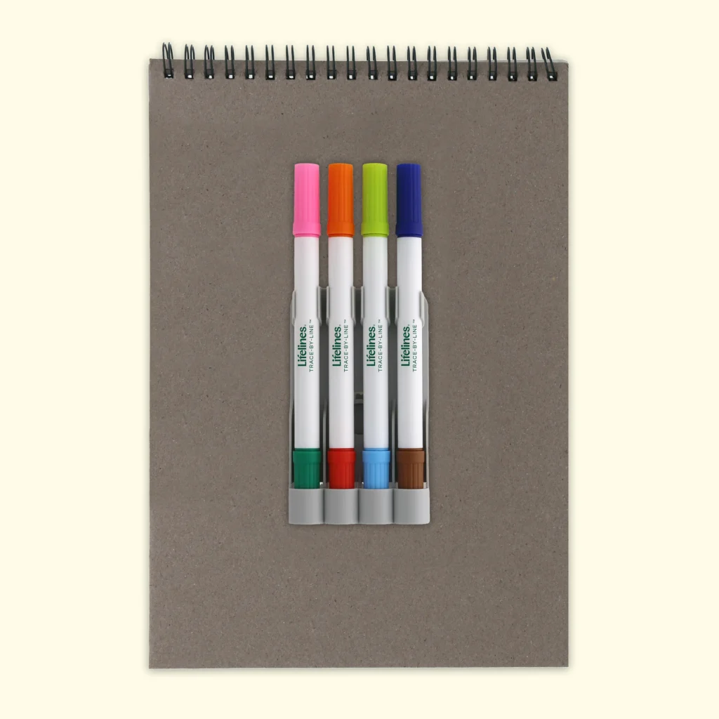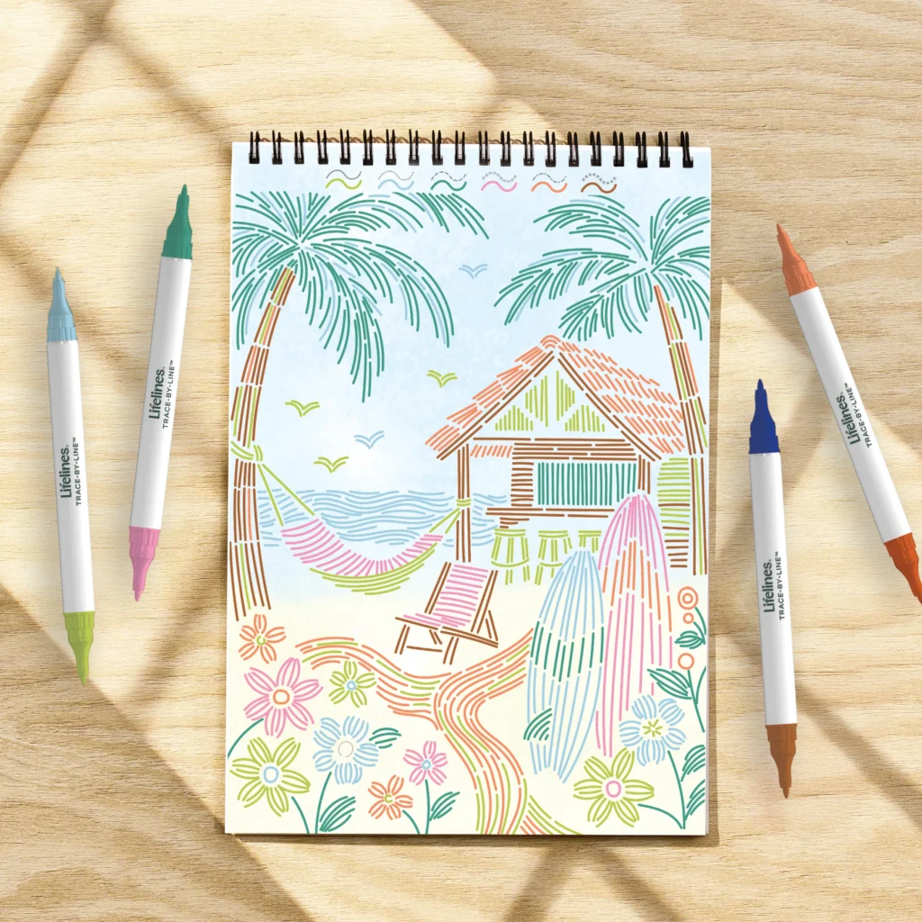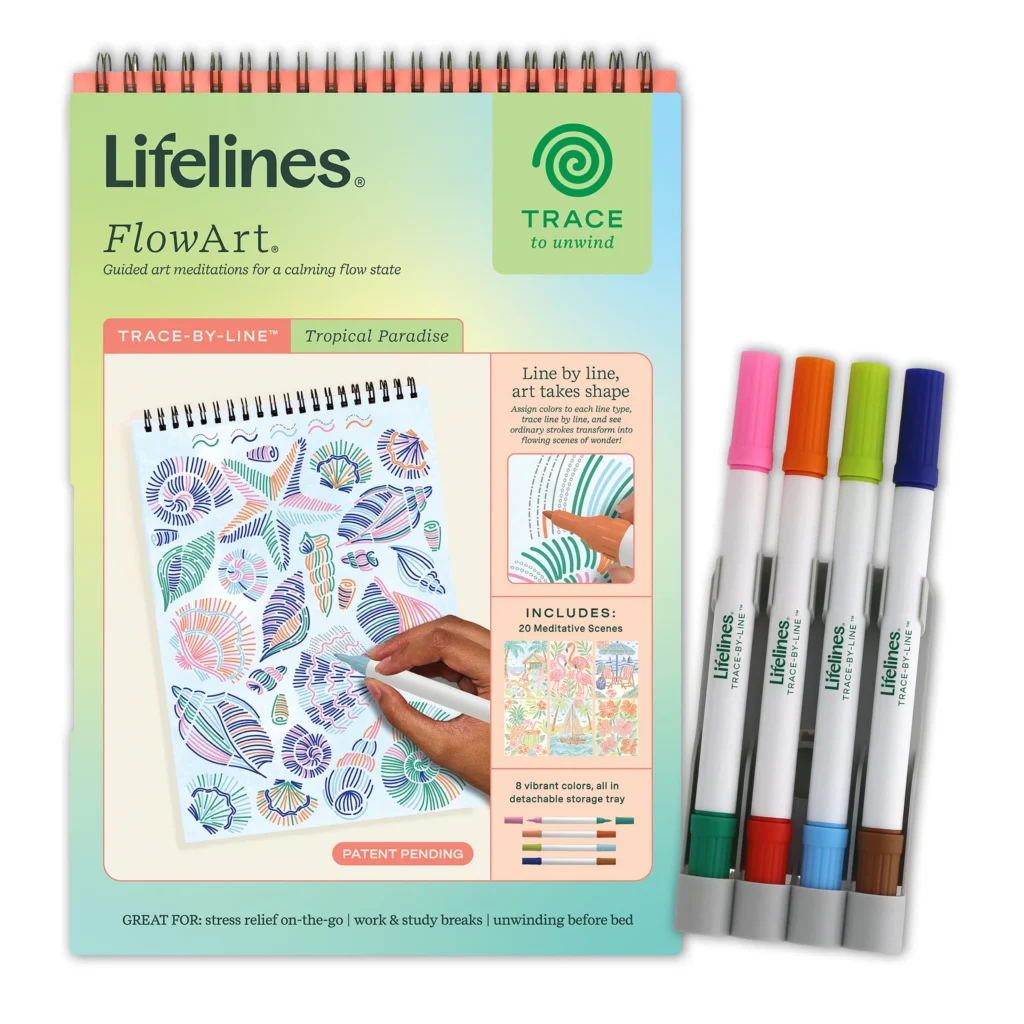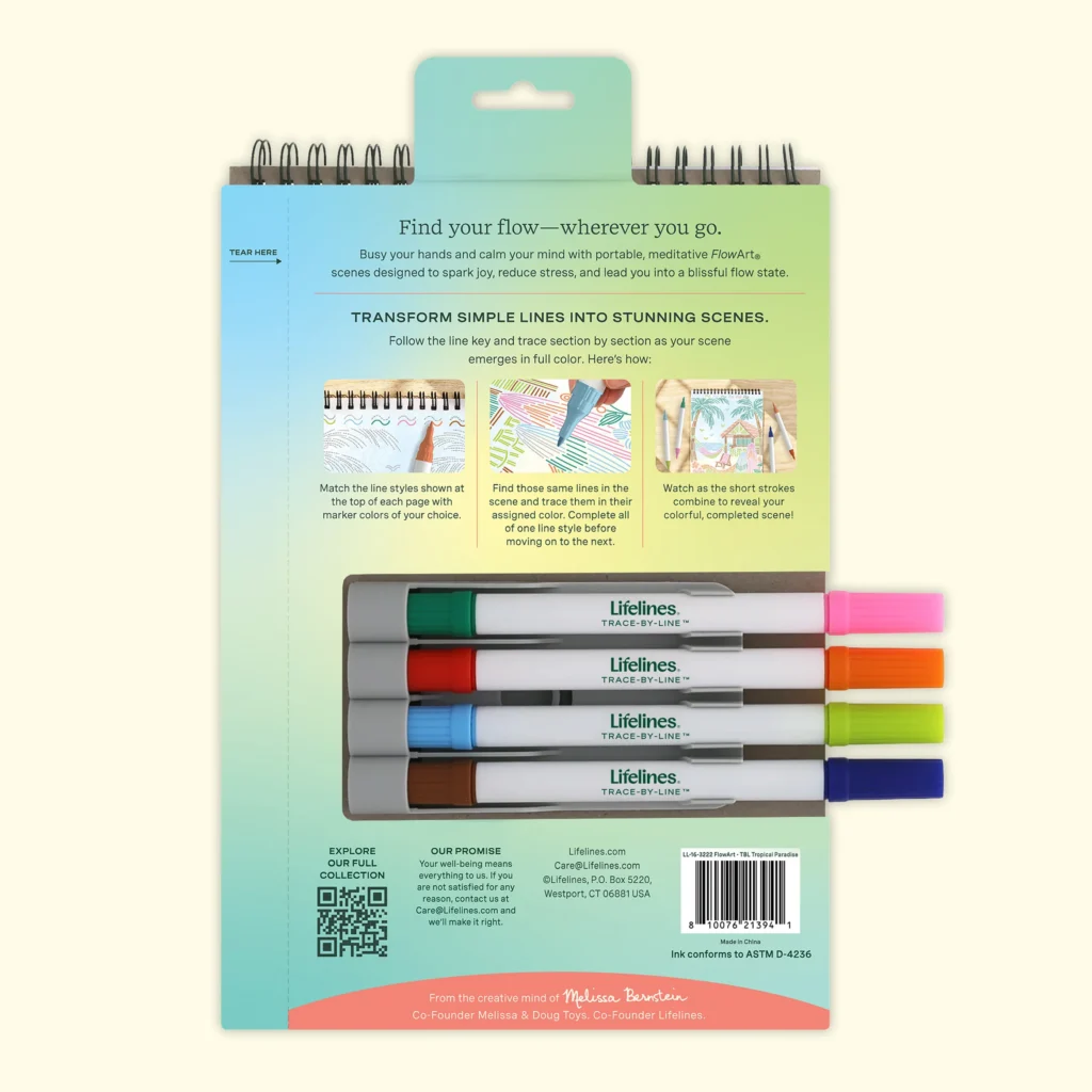 Lifelines FlowArt Pads are guided art meditations designed to help you achieve a calming flow state. Each scene is thoughtfully crafted to encourage repetitive, relaxing movements, promoting mindfulness and reducing stress. Trace-by-Line includes 20 meditative scenes and four double-sided markers in a detachable storage tray. Engage in a meditative tracing activity using a guided key to fill the page with vibrant lines, creating beautiful tropical scenes. Simply match the colors to the lines, and let the rhythmic motion of tracing bring you a sense of calm. Compact and portable, this pad is perfect for calming your mind on-the-go, unwinding before bed, or taking a work or study break to de-stress.