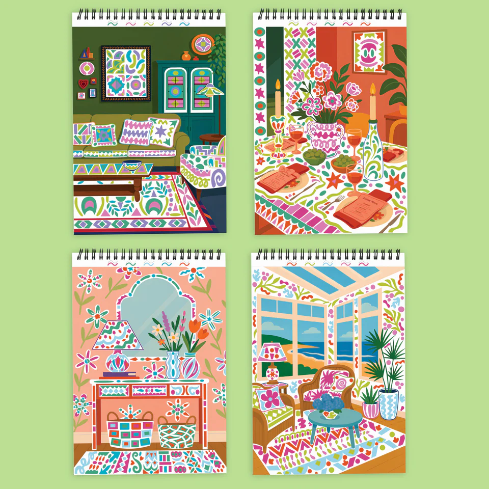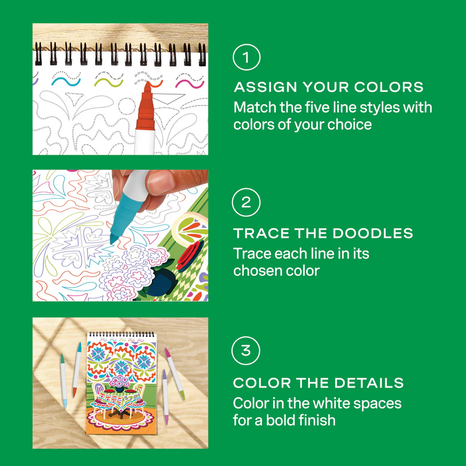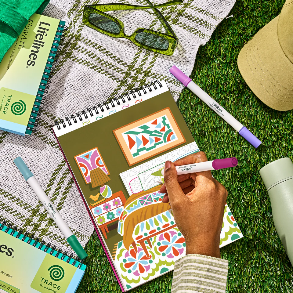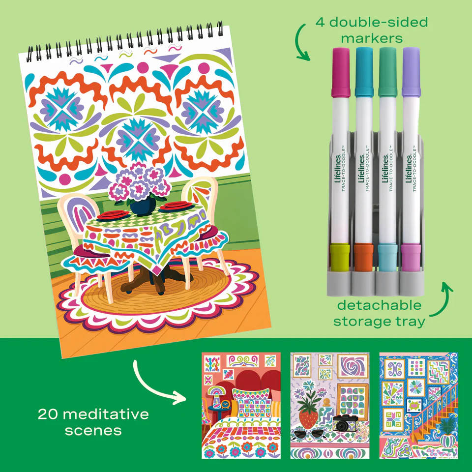 Lifelines FlowArt Pads are guided art meditations designed to help you achieve a calming flow state. Each scene is thoughtfully crafted to encourage repetitive, relaxing movements, promoting mindfulness and reducing stress. Trace-to-Doodle includes 20 meditative scenes and four double-sided markers in a detachable storage tray. Engage in a meditative tracing activity by tracing the lines with vibrant color, creating delightful interior design scenes. Let the rhythmic motion of tracing bring you a sense of calm. Compact and portable, this pad is perfect for calming your mind on-the-go, unwinding before bed, or taking a work or study break to de-stress.