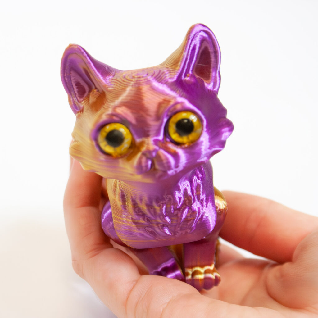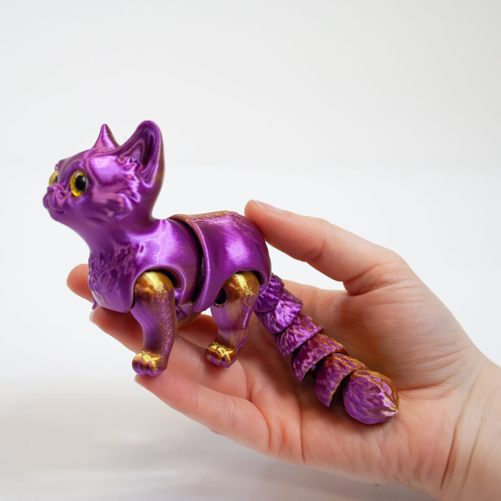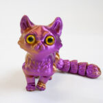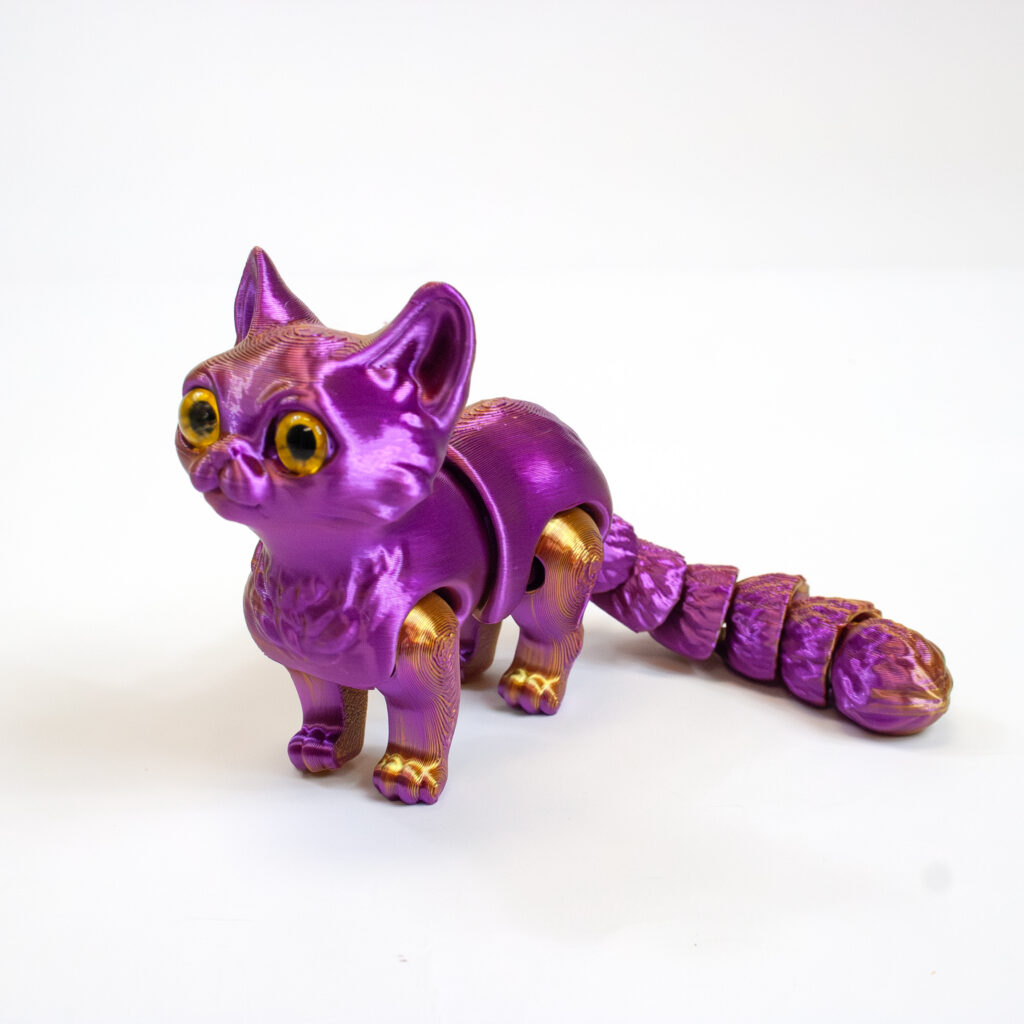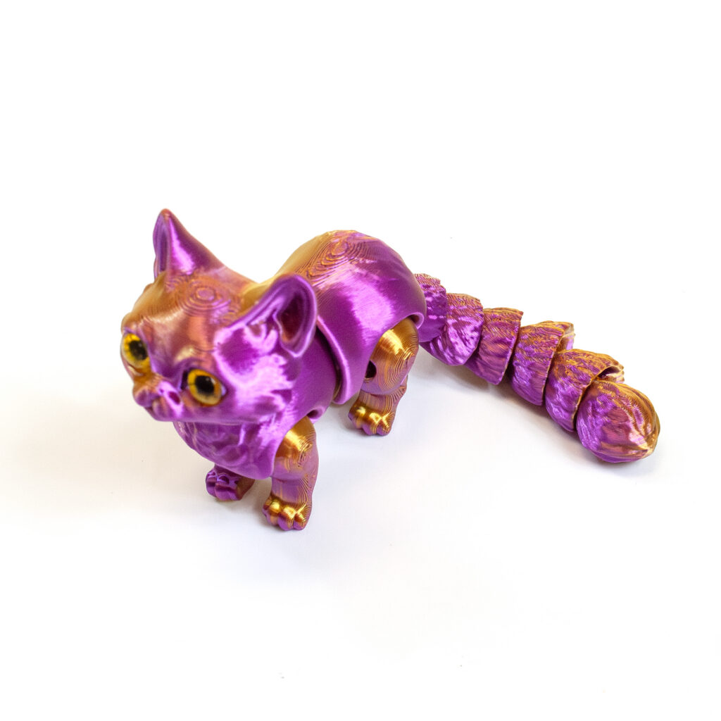 Each Twiddle Kitty is 3D printed with beautiful iridescent colors and measures approximately 6″ long (including tail).