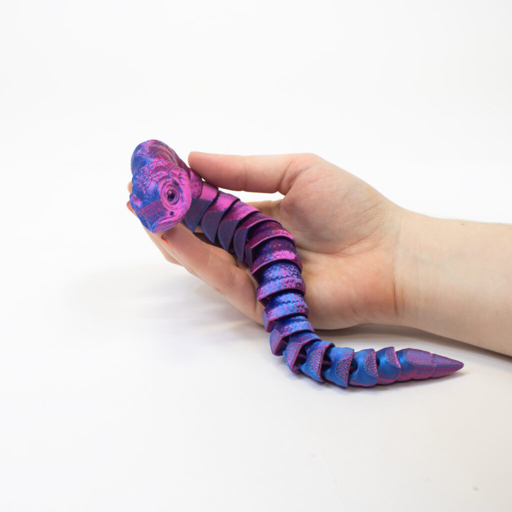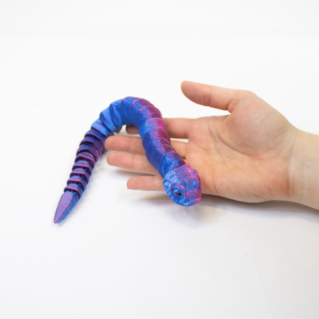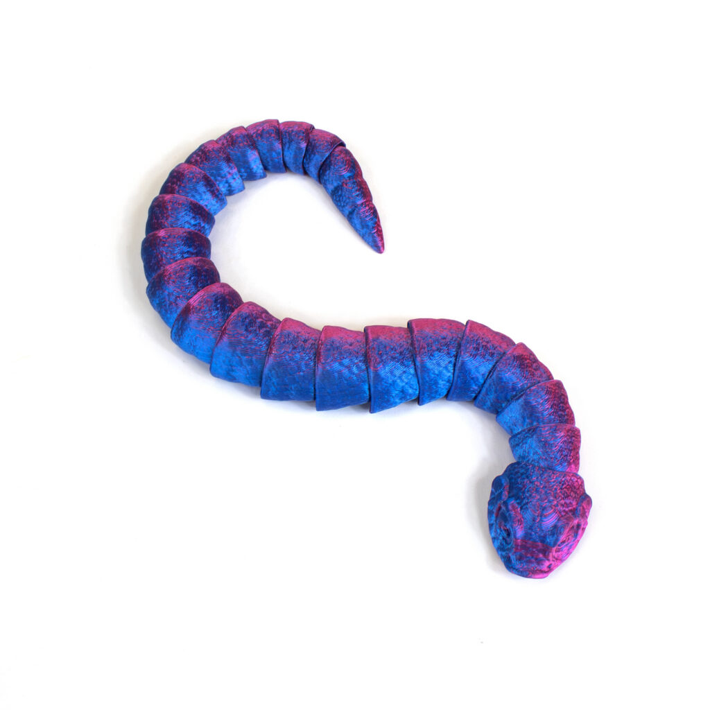 Each Twiddle Snake is 3D printed with beautiful iridescent colors and measures approximately 10.5″ long.