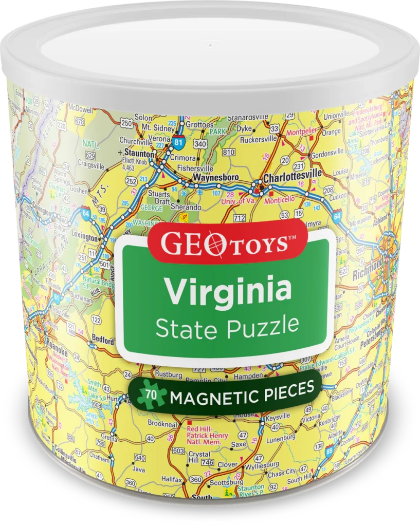 Let’s take a tour of Virginia! This fun and detailed 70-piece magnetic puzzle gives you a whole new perspective on your home state by taking you deep inside Virginia, with markings for major highways, parks, and landmarks. With a magnetic backing, this 13 x 10 inch jigsaw puzzle is packaged in small, adorable cans, which make the perfect gift, stocking stuffer, or easy-to-pack activity. The magnetic backing means you can put it together on your table, your refrigerator, or even on a cookie tray in the car!