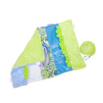 The multi-colored pad features sections styled around the central panel of a beautiful spring-green, soft-blue, and purple floral pattern! Each panel features different, interesting textures – such as dotted fabric, textured minky, fuzzy sky-blue fabric, and more, plus two rows of soft loops that are perfect for threading fingers through. These different textures are good for visual and textural sensory needs! The pad is backed with bumpy green minky fabric. A wrist weight fidget is included which can be attached to one of the four tabs.