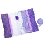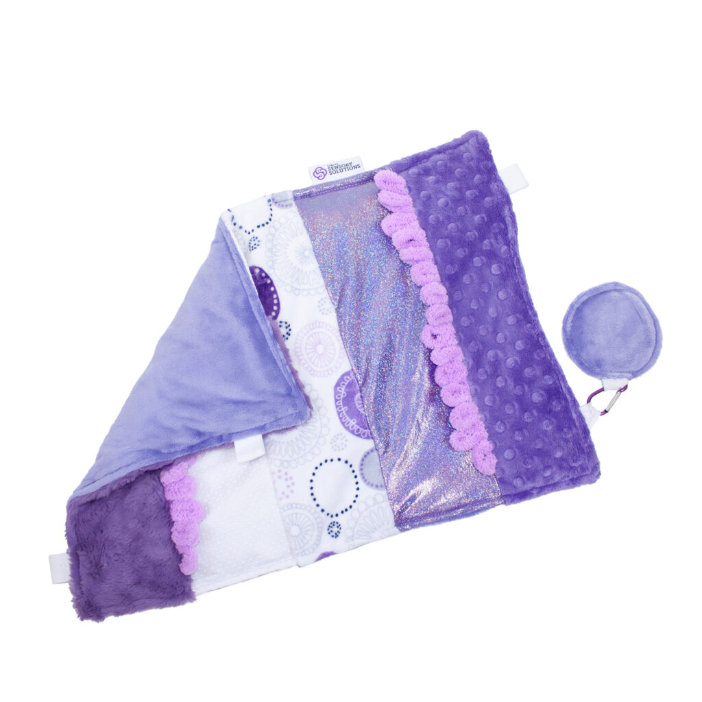 The multi-colored pad features sections styled around the central panel of a fun purple polka dot circle pattern! Each panel features different, interesting textures – such as dotted fabric, textured minky, fuzzy vibrant purple fabric, and more, plus two rows of soft loops that are perfect for threading fingers through. These different textures are good for visual and textural sensory needs! The pad is backed with soft, purple minky fabric. A wrist weight fidget is included which can be attached to one of the four tabs.