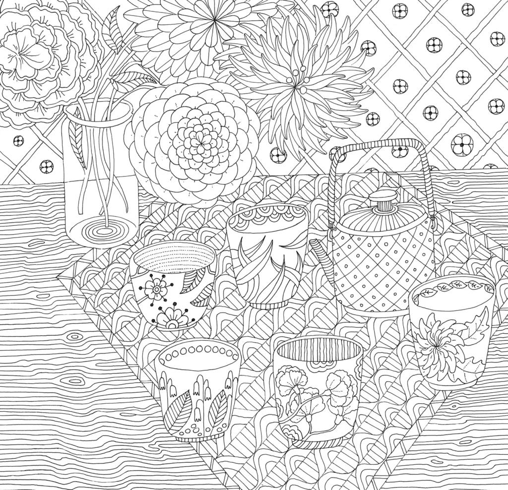 - Free your mind and ease into the blissful calm of coloring birds, butterflies, pools, pagodas, and more in a serene garden setting.